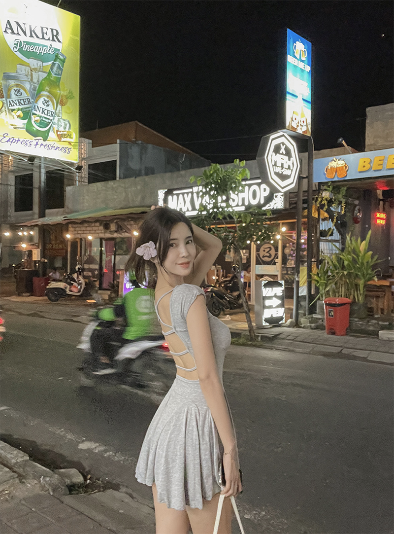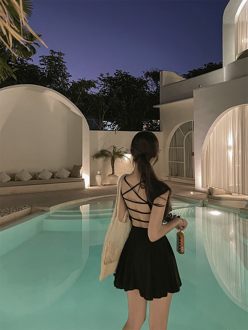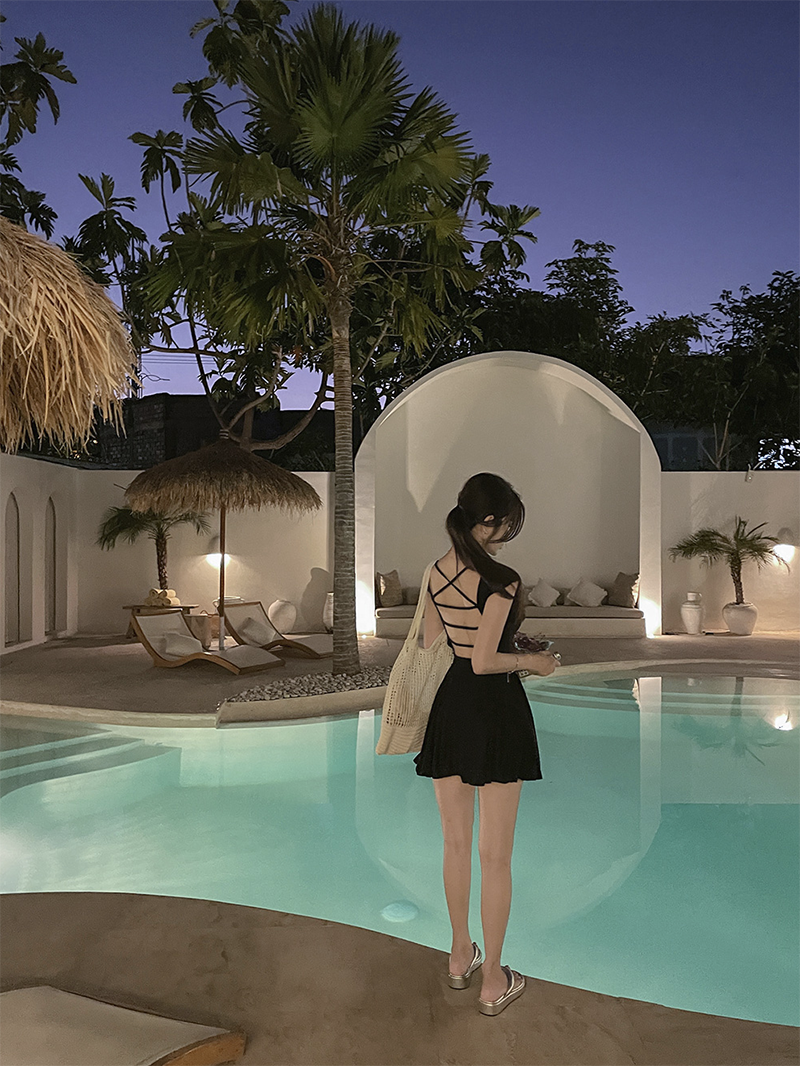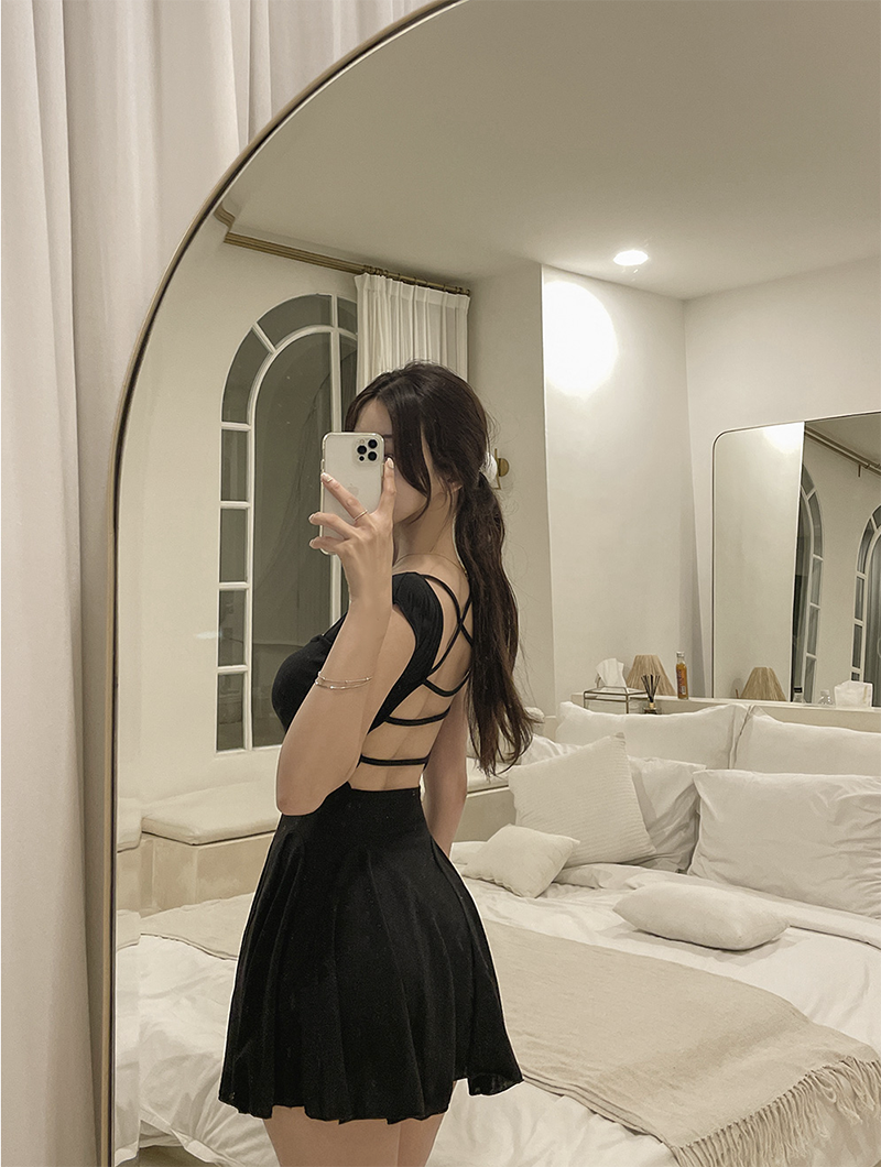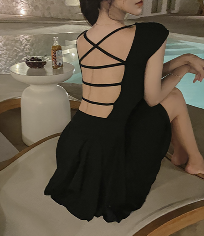 倒置露背吊帶設計