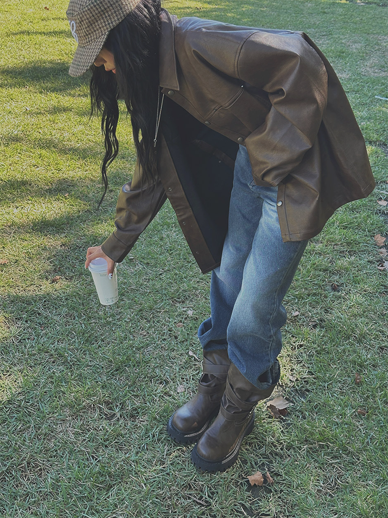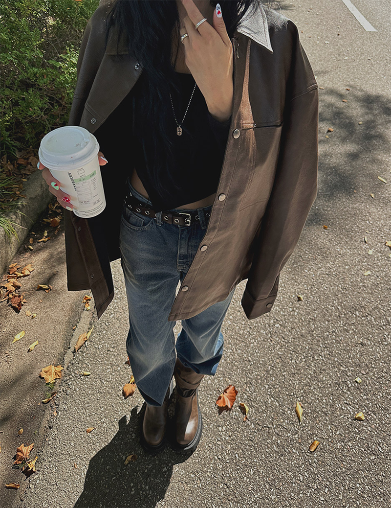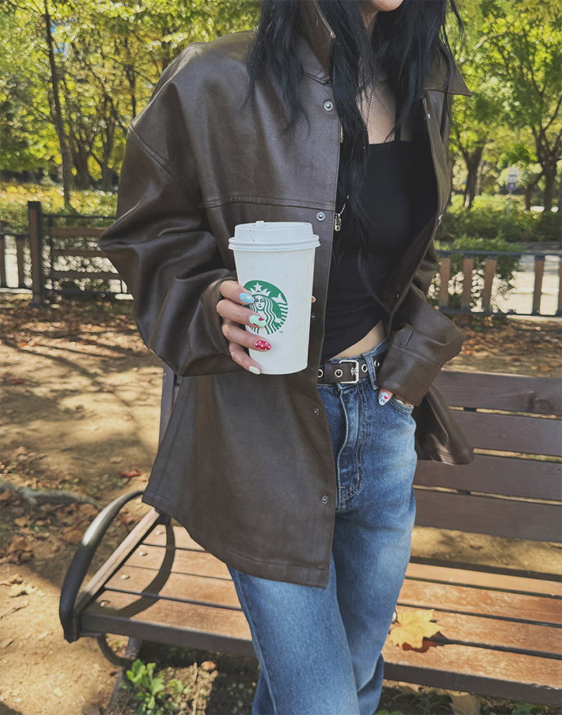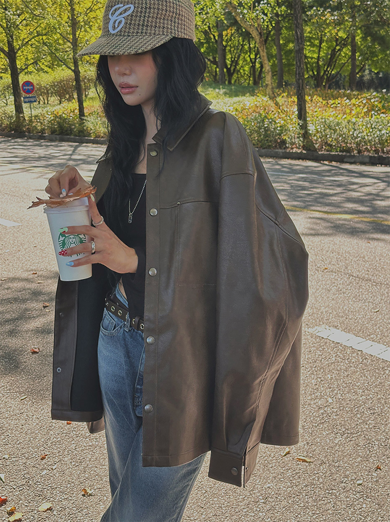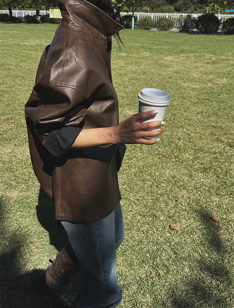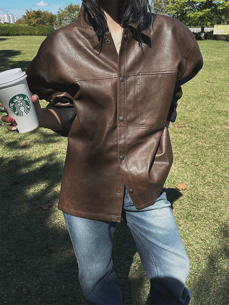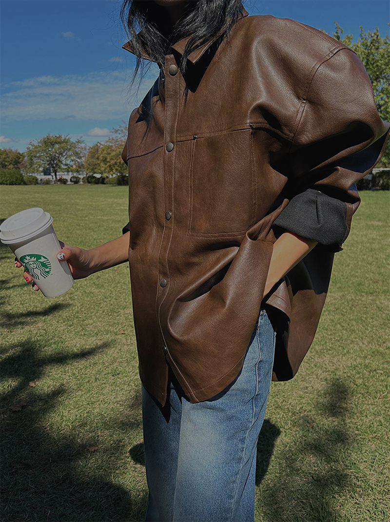 以滑順仿皮材質打造的剪接設計皮革外套