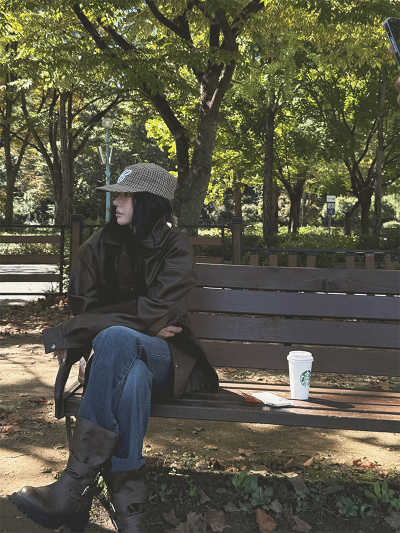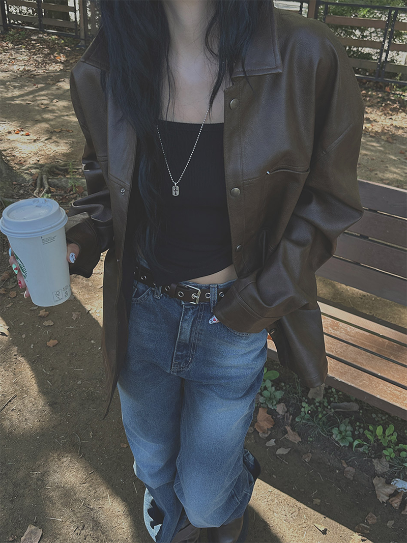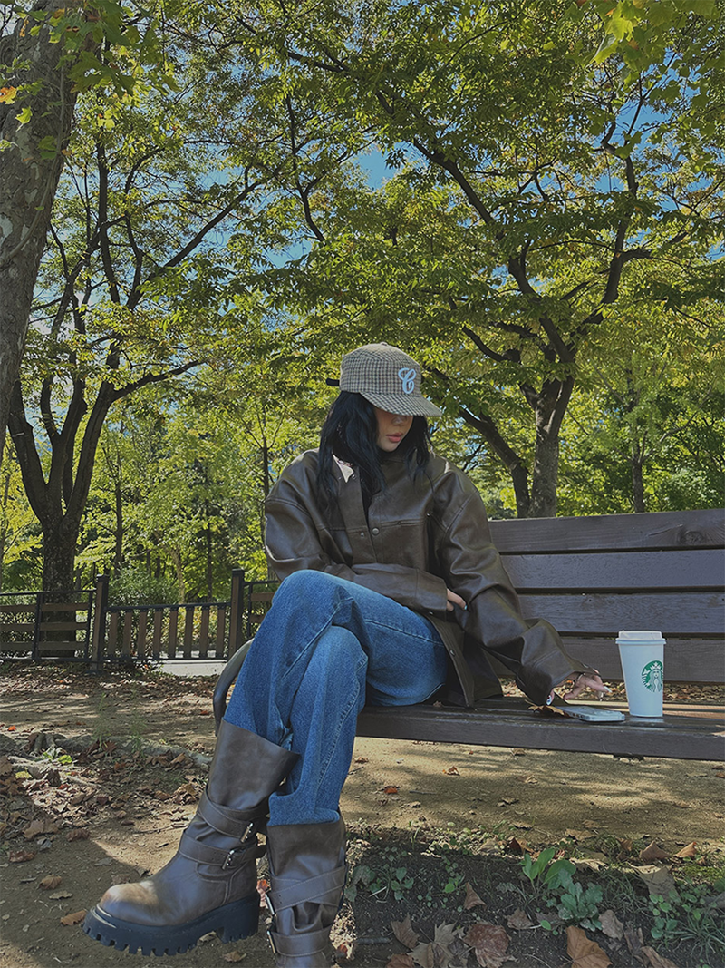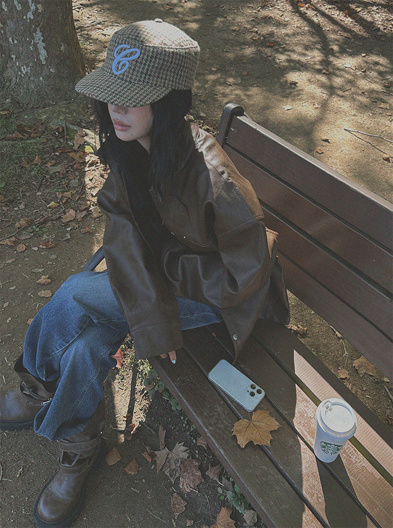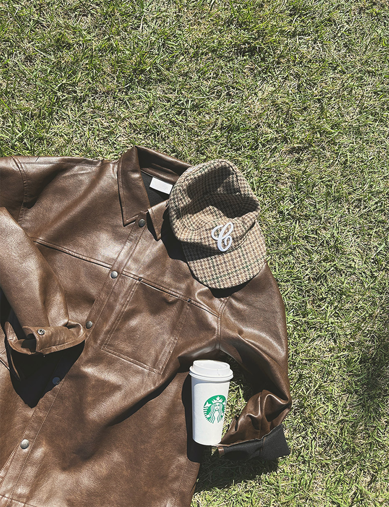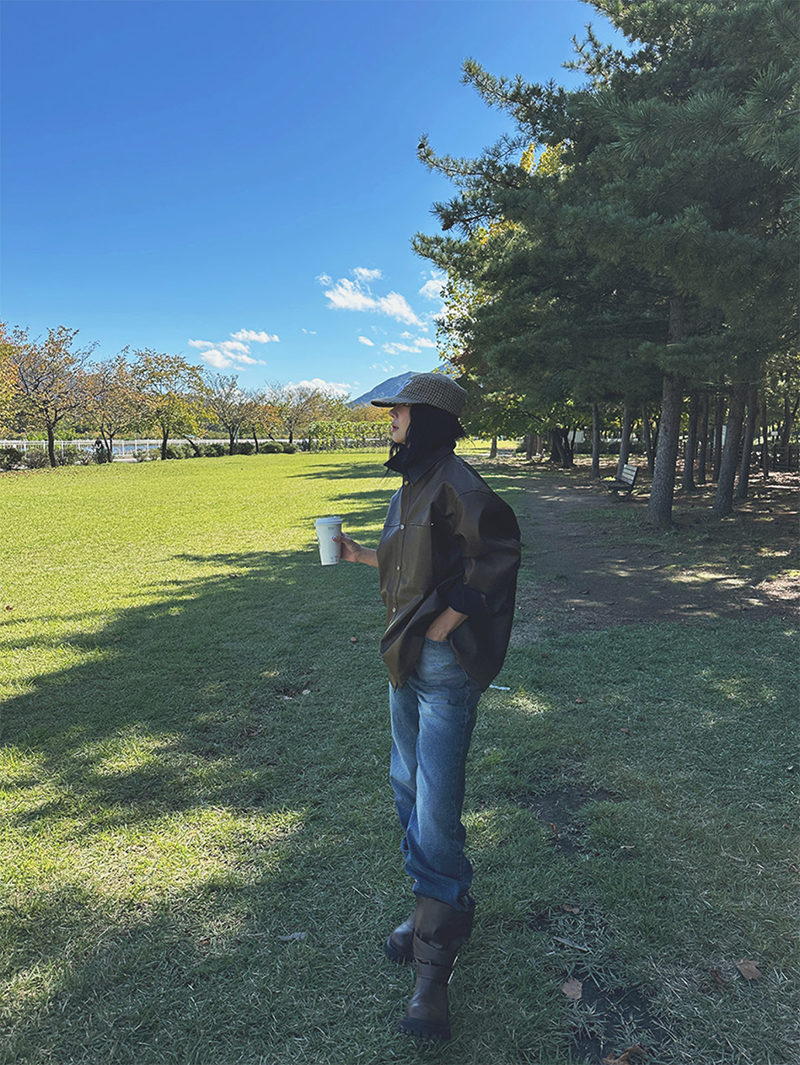以滑順仿皮材質打造的剪接設計皮革外套
