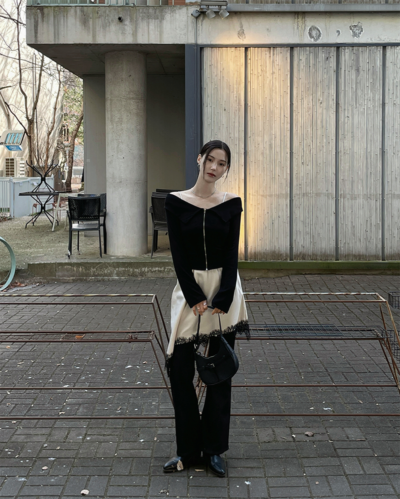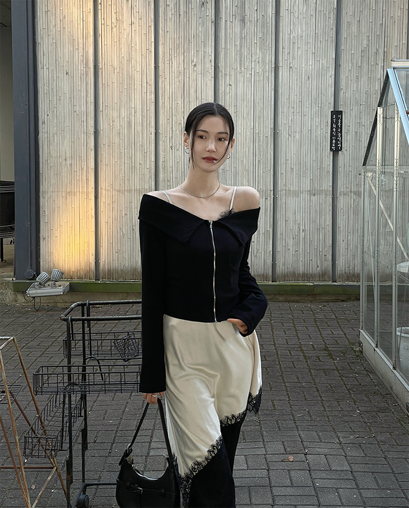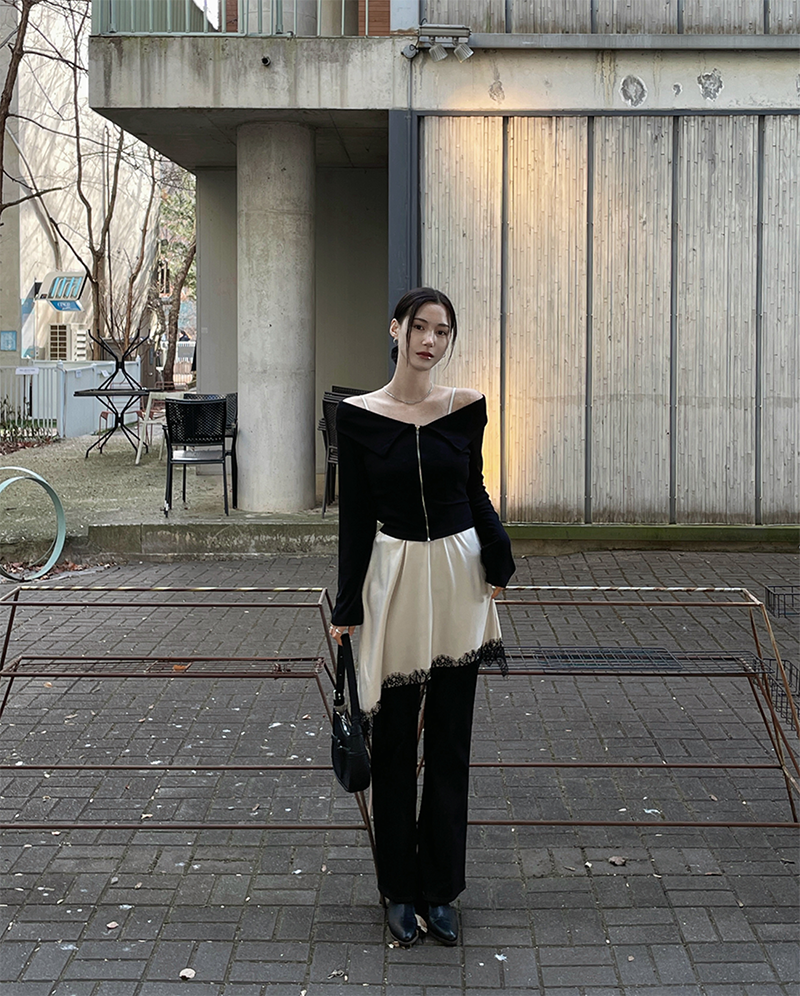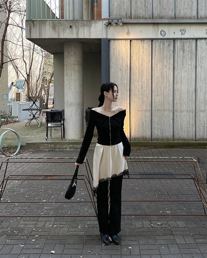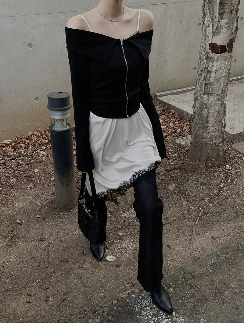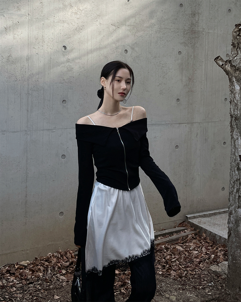 翻摺露肩設計自然勾勒鎖骨與肩線比例
