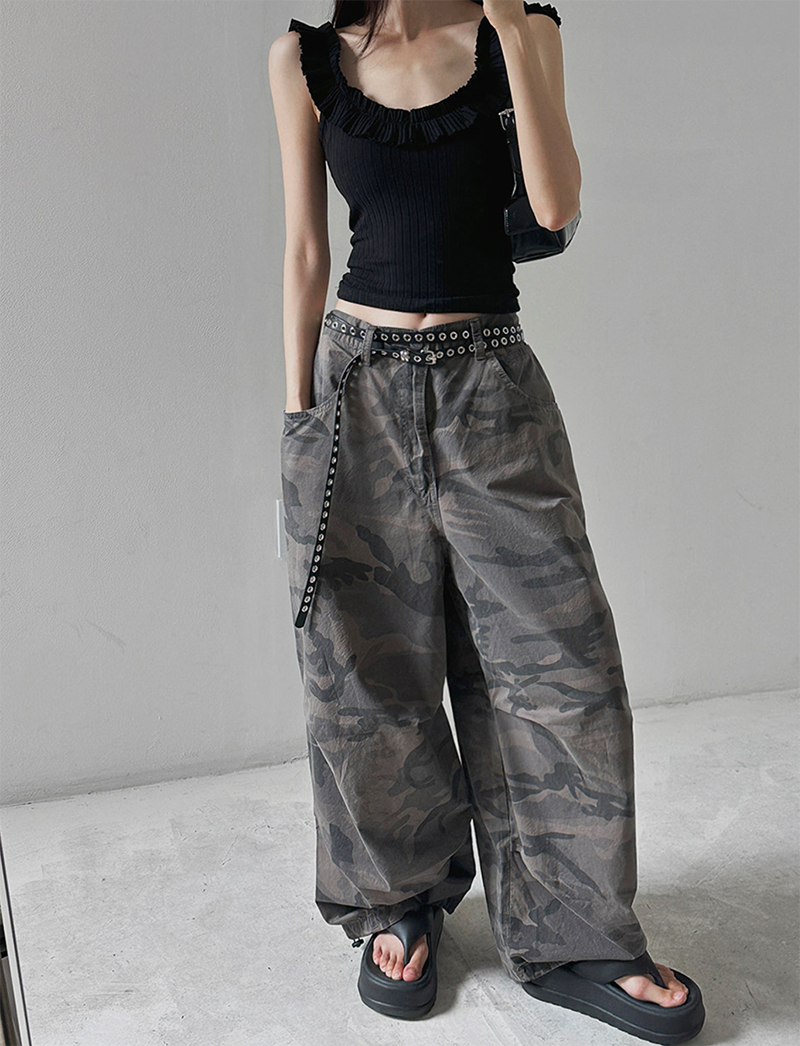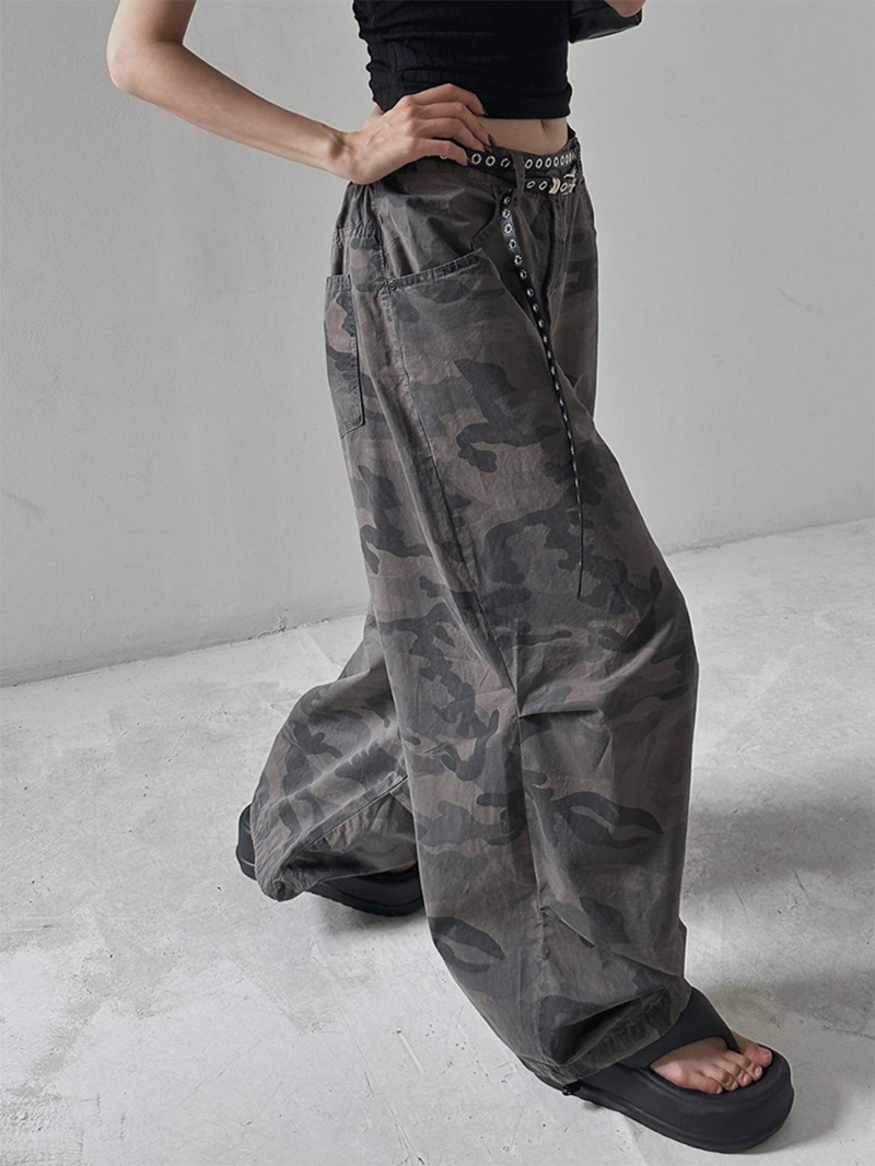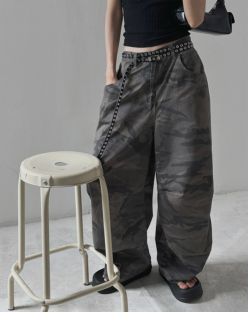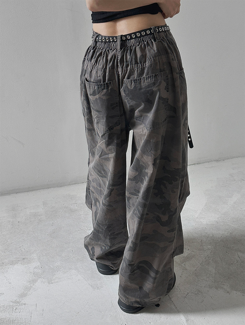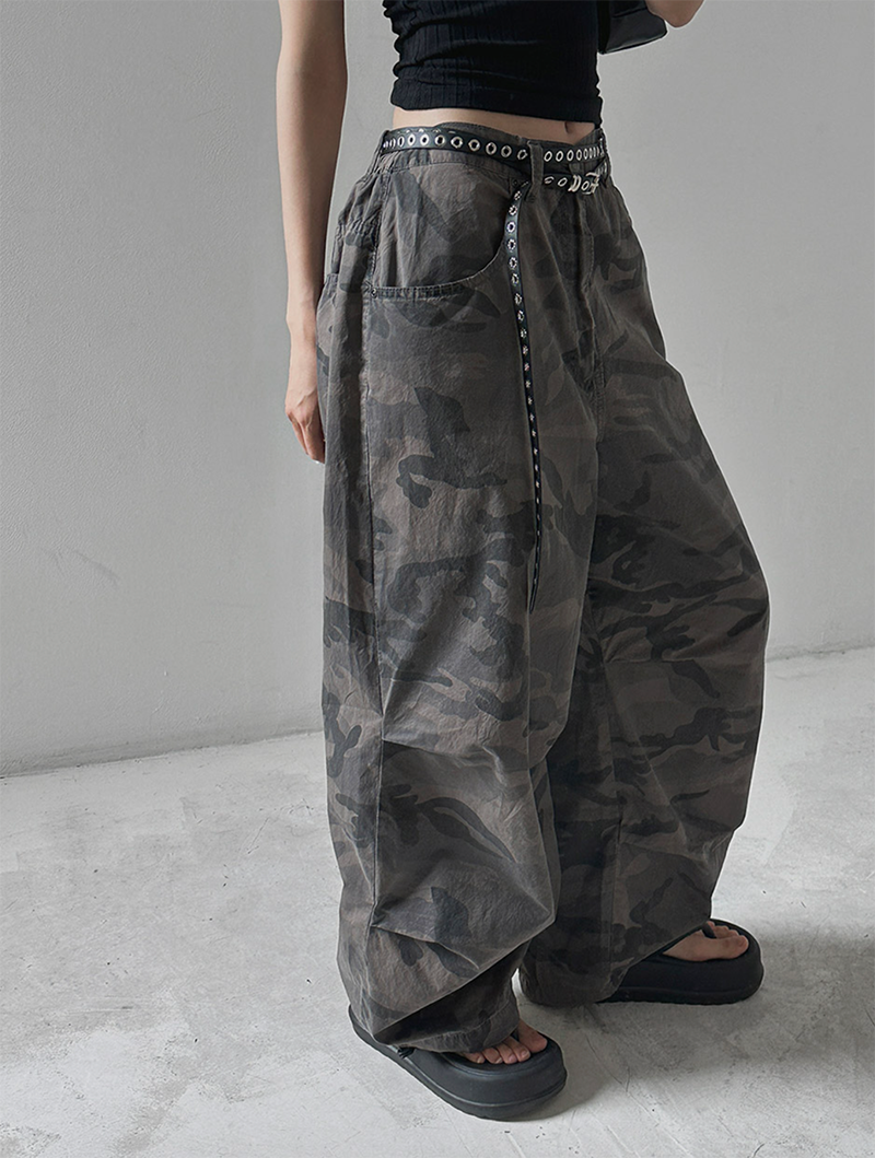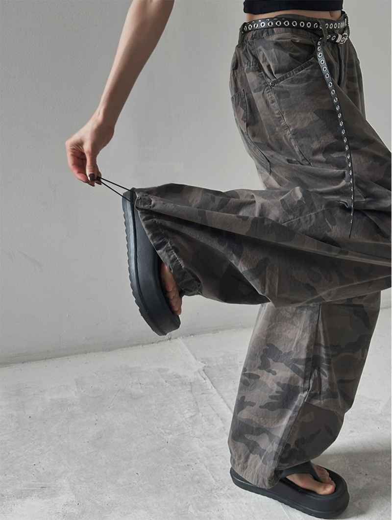 街頭滿載迷彩傘兵抽繩寬褲-炭色M (現貨)