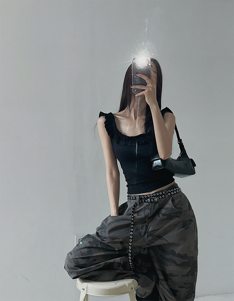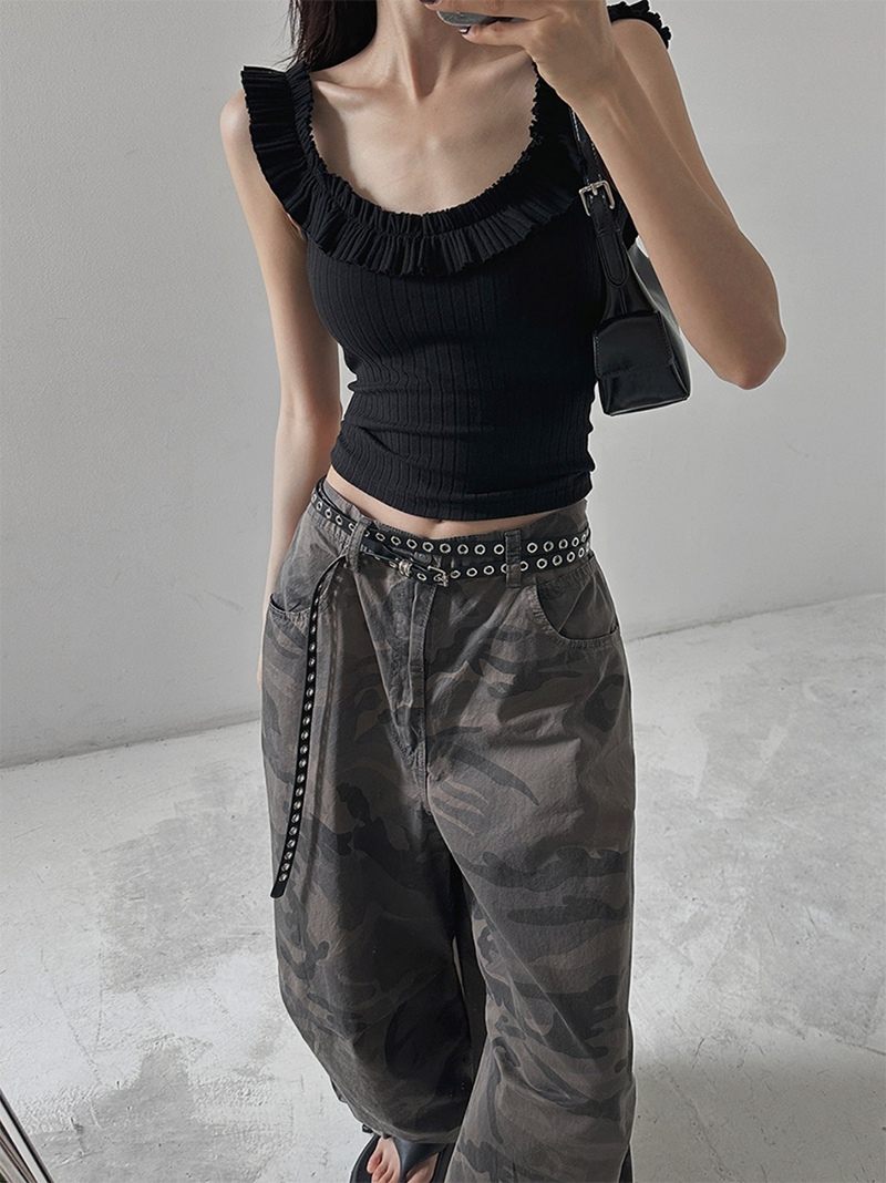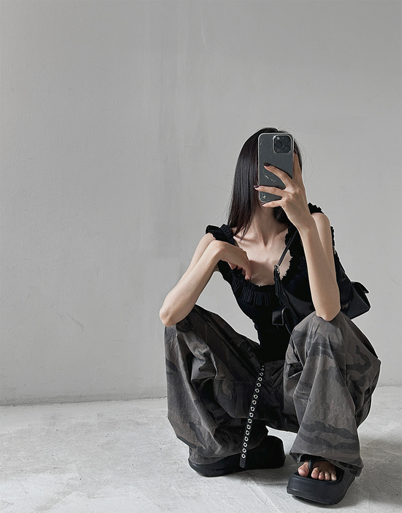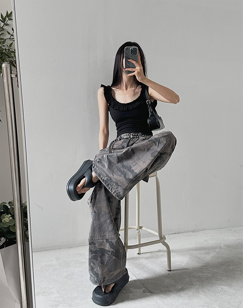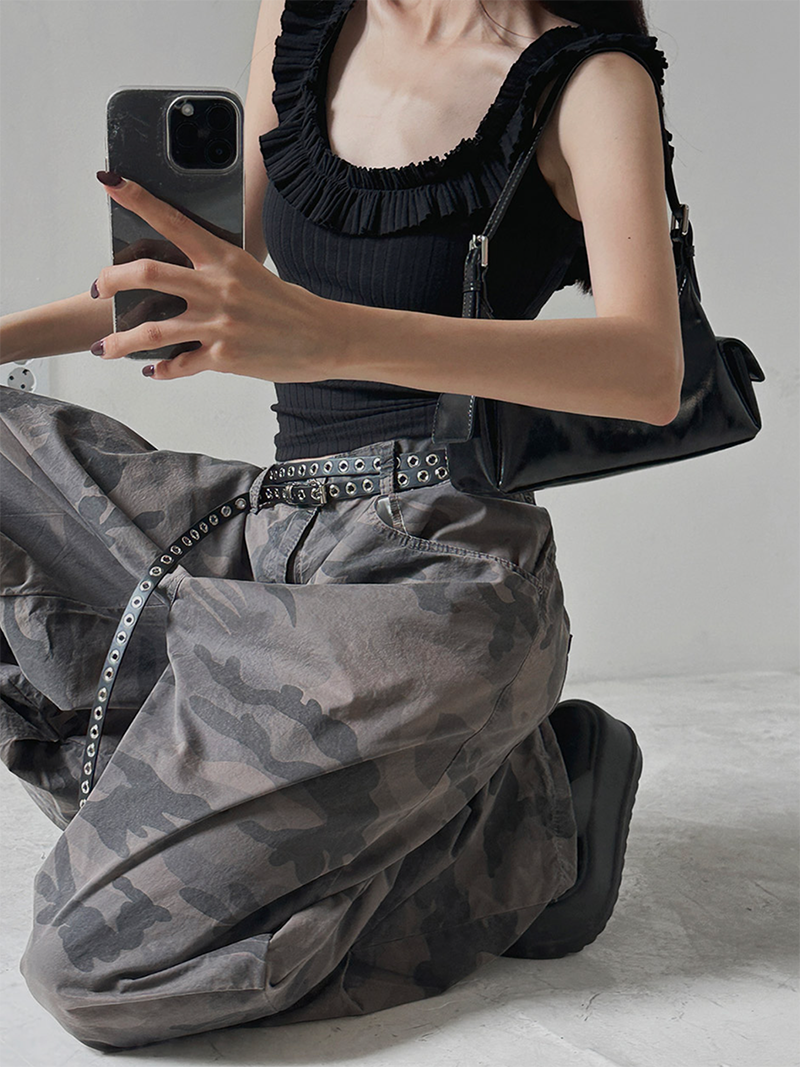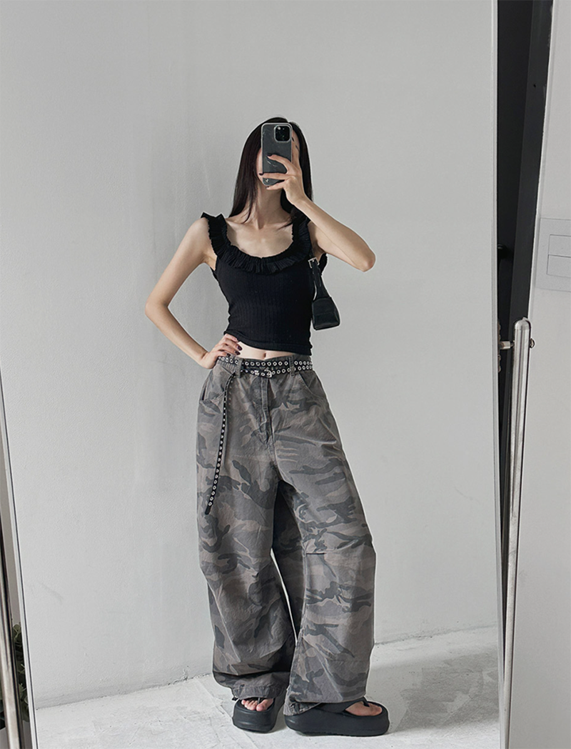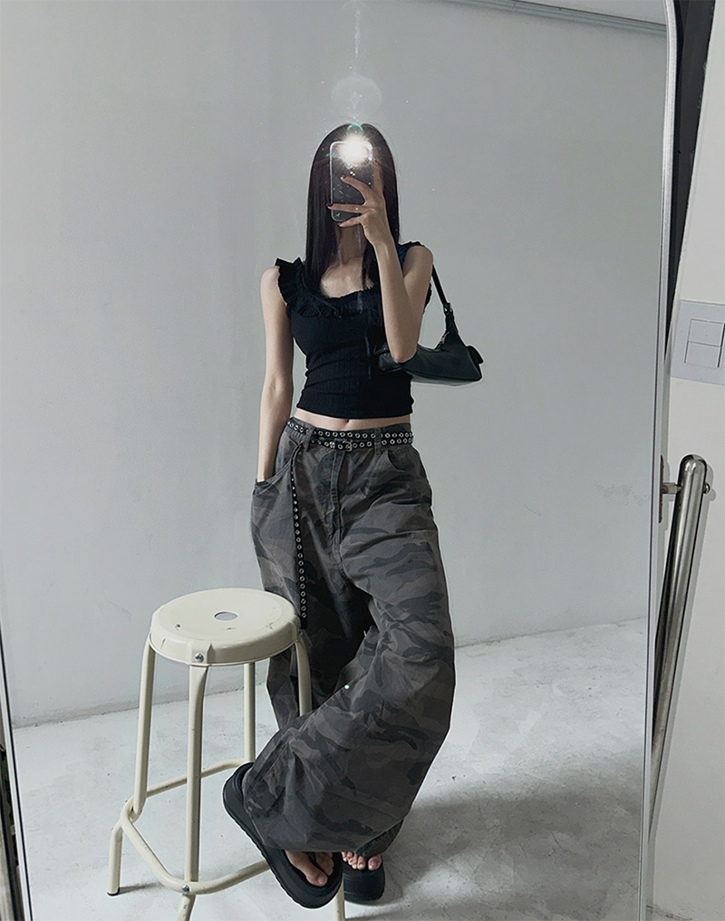 街頭滿載迷彩傘兵抽繩寬褲-炭色M (現貨)