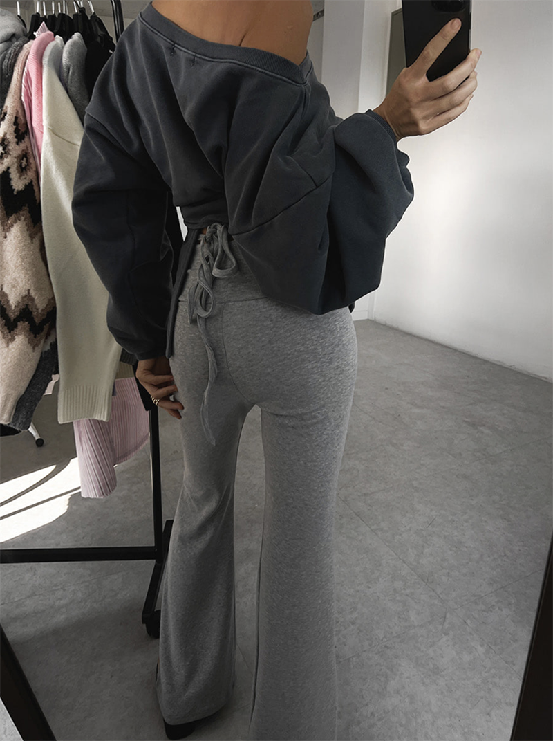 靴型剪裁結合褲頭抓皺與腰綁帶設計