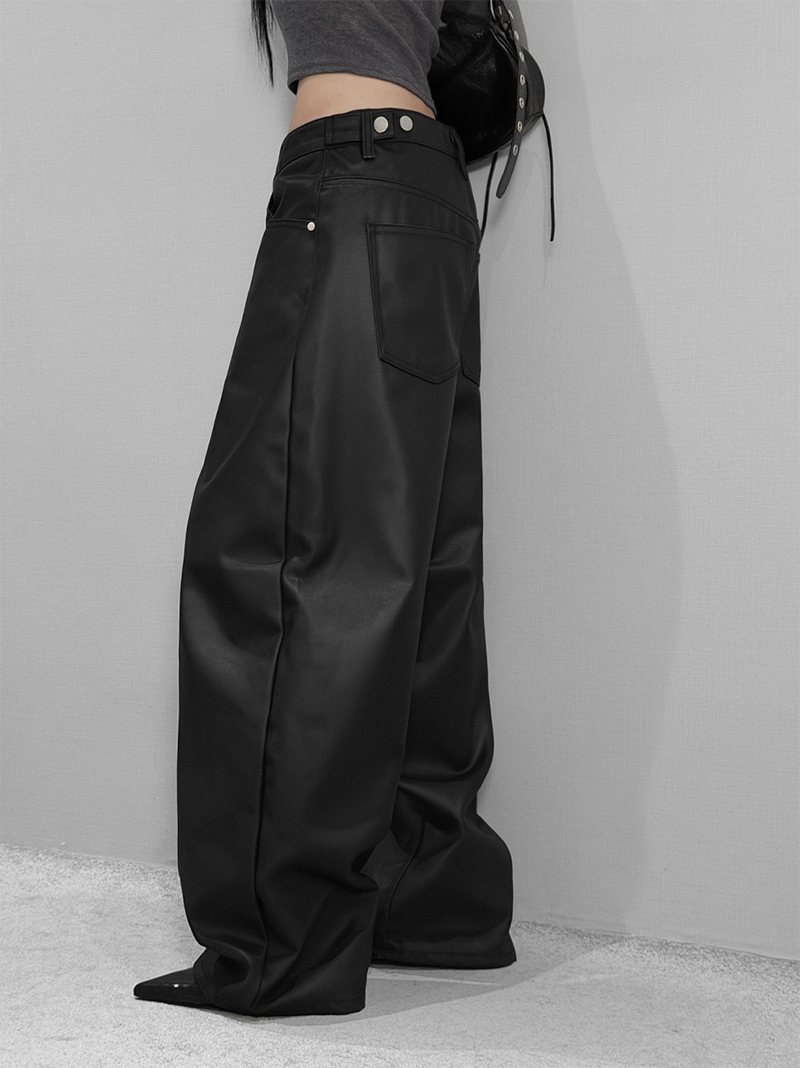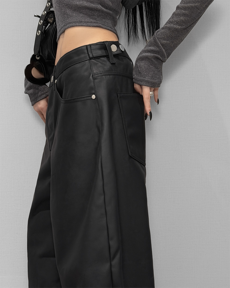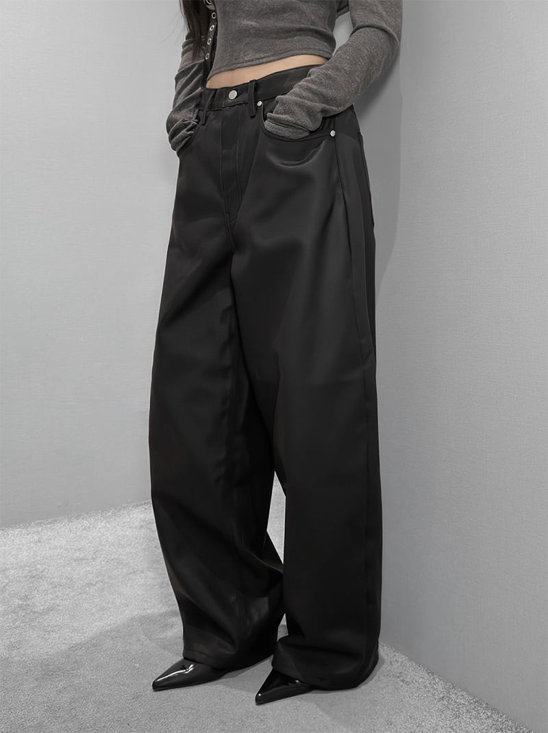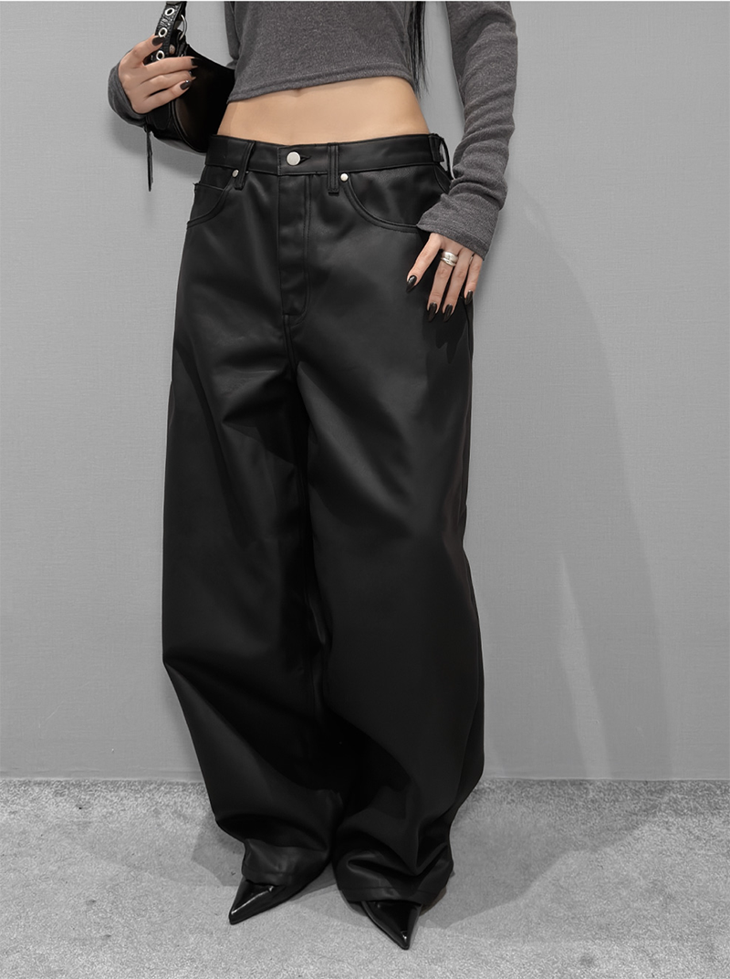 這款闊腿寬褲採用霧面仿皮革質感