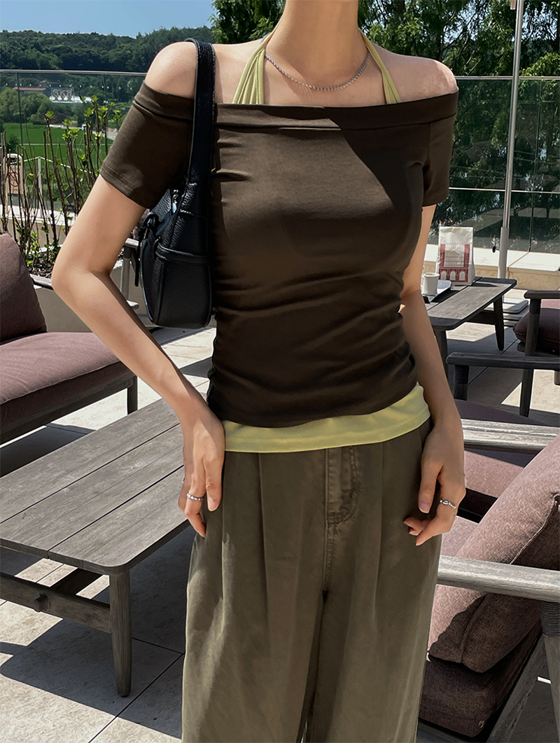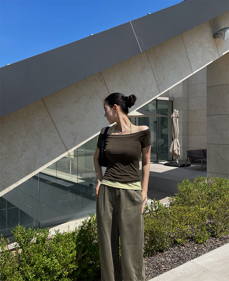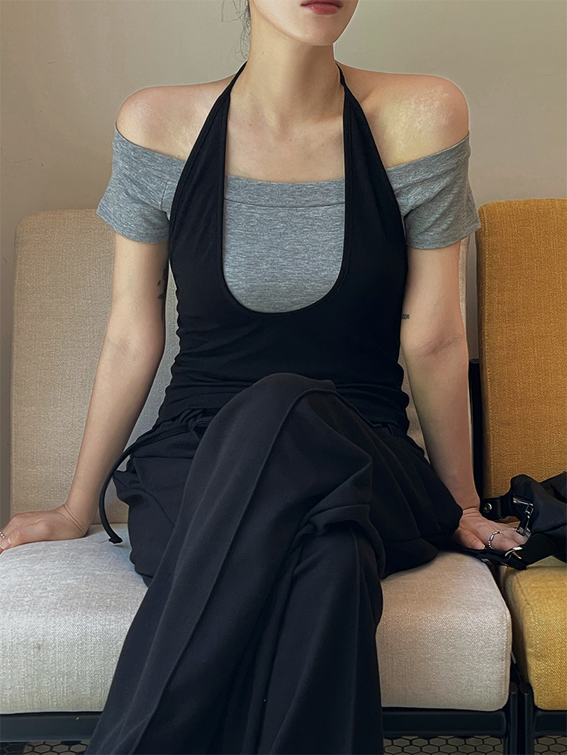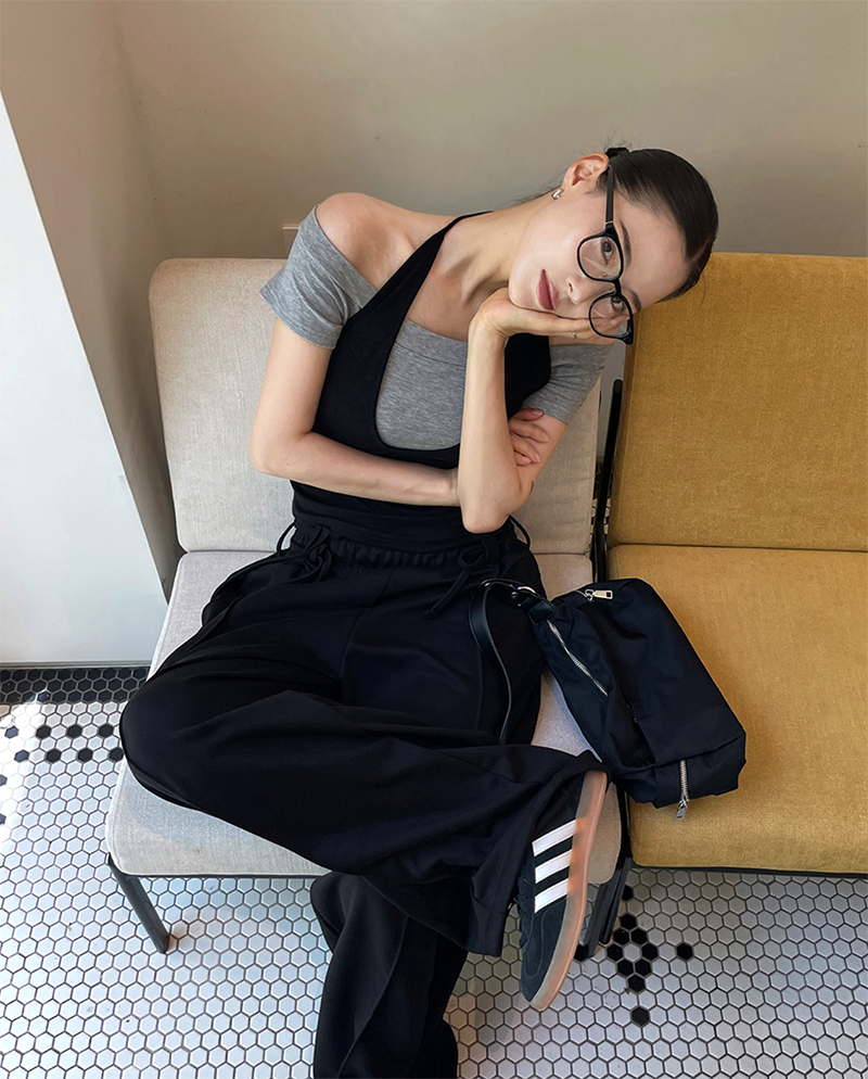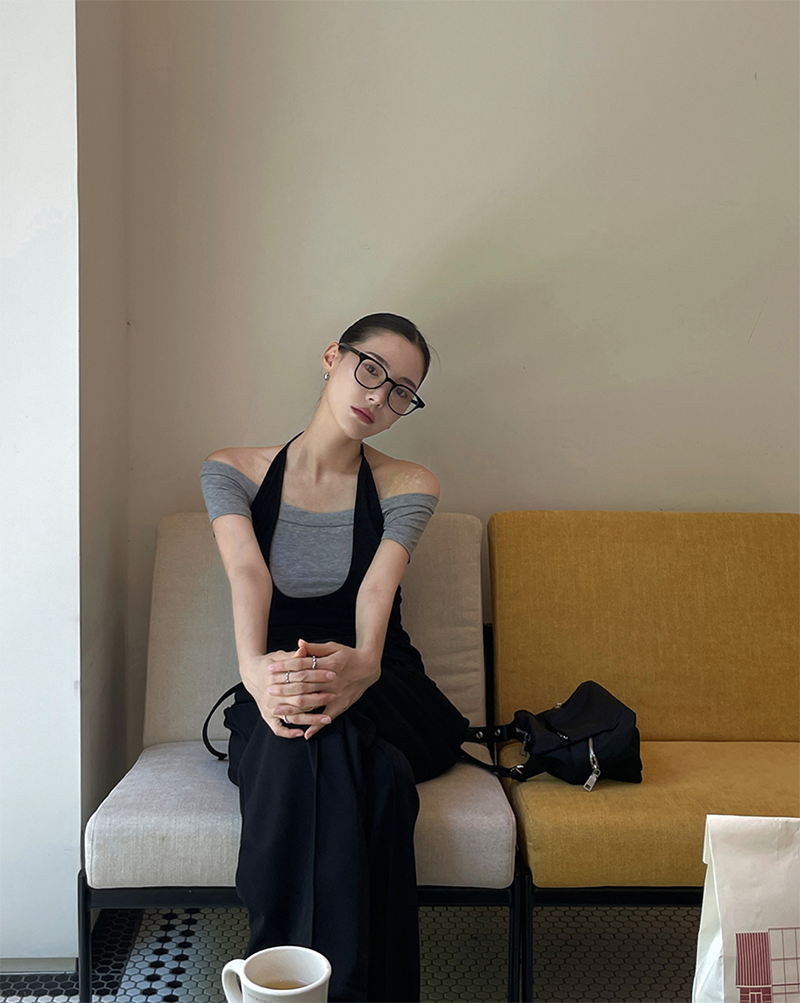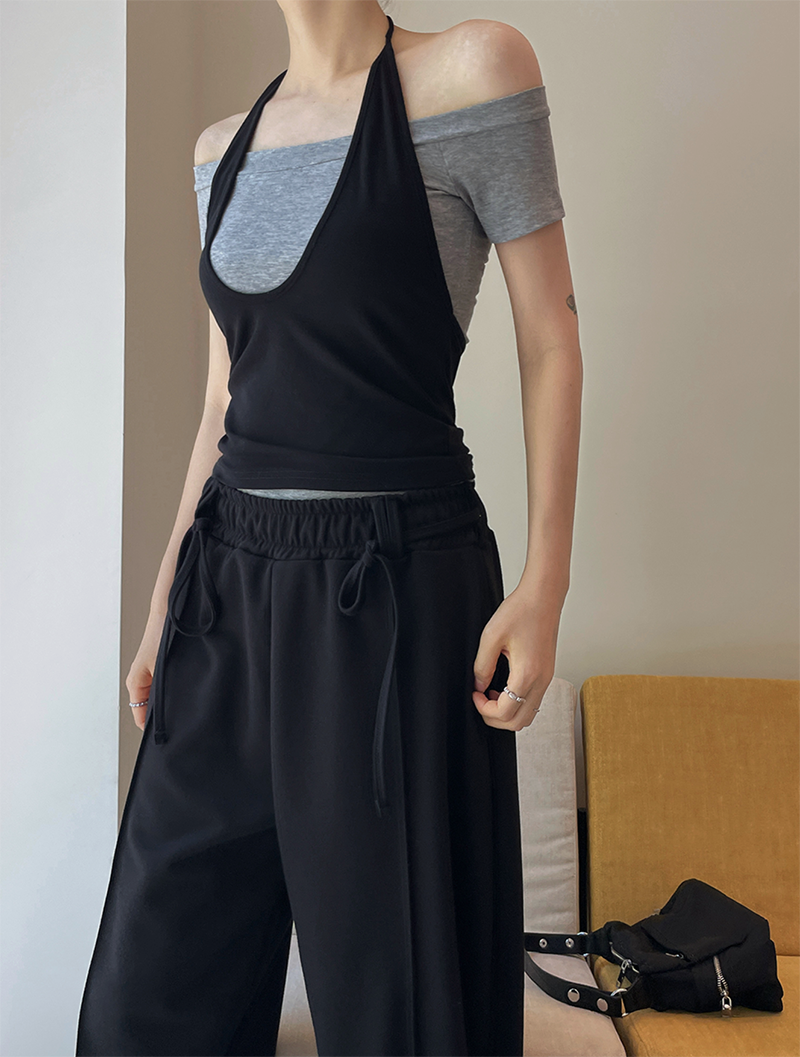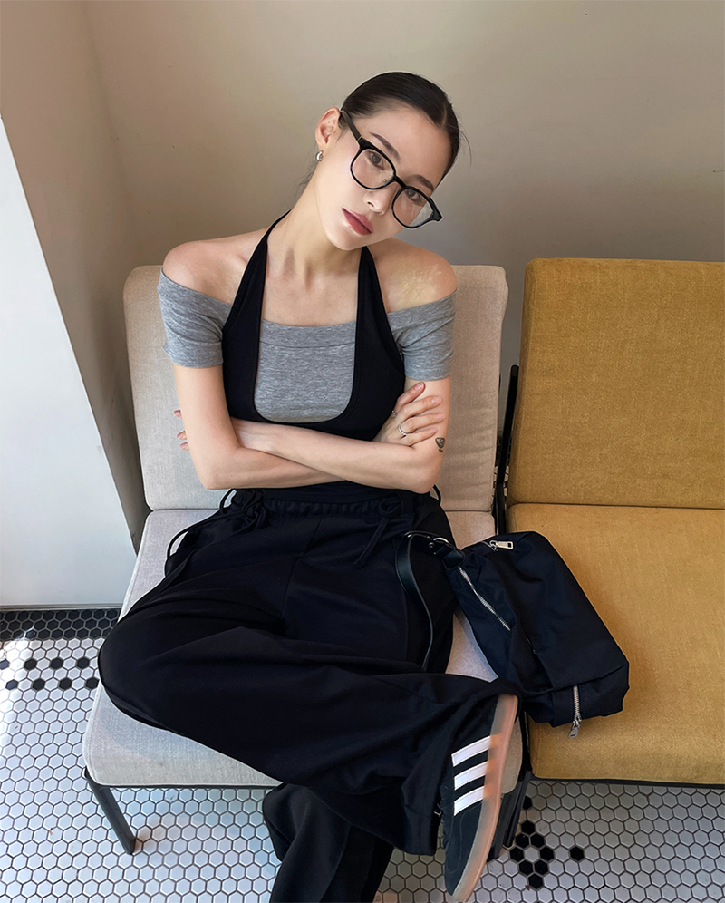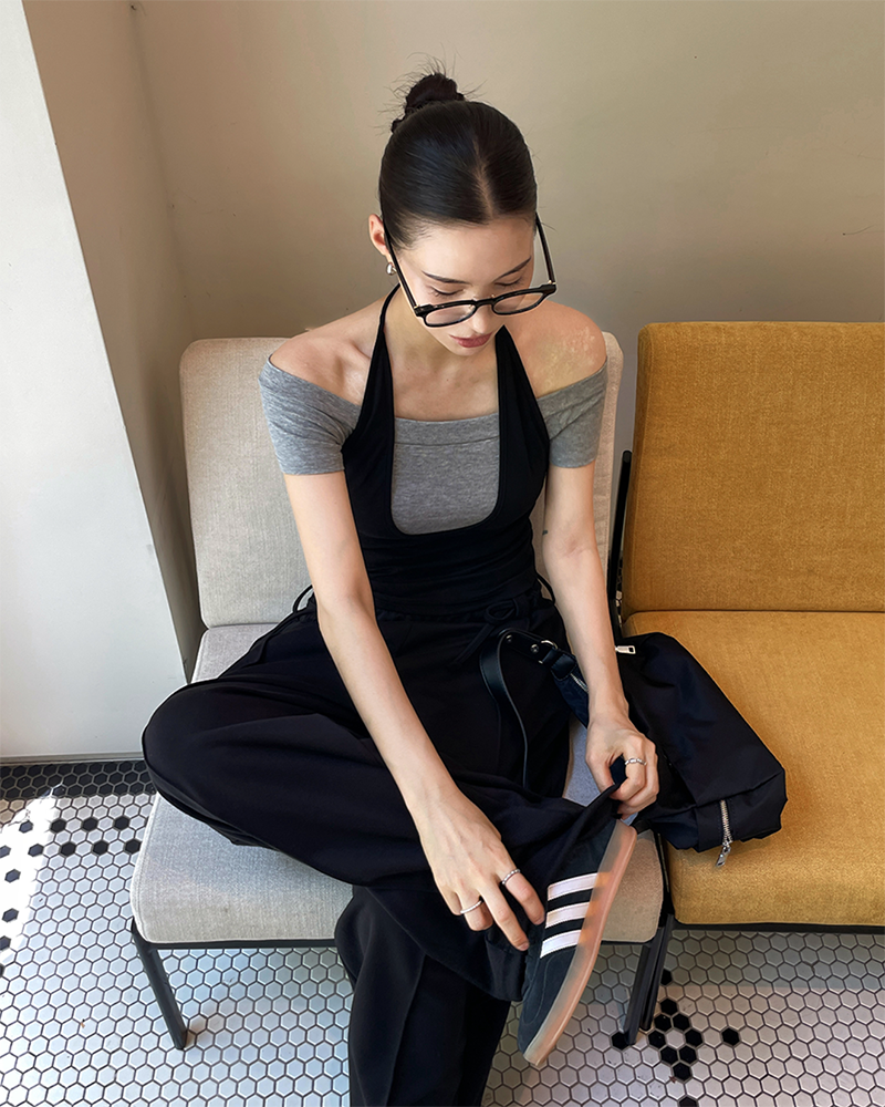 結合配色露肩T與內搭掛脖背心的時髦套裝