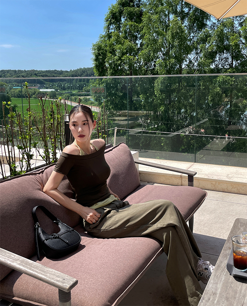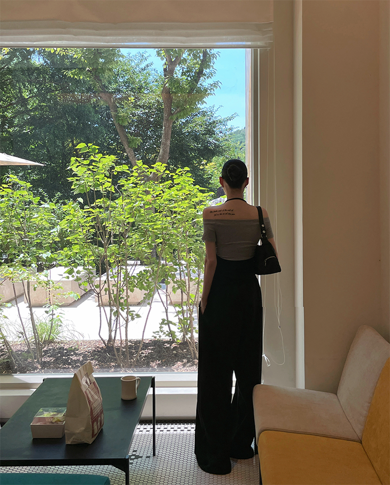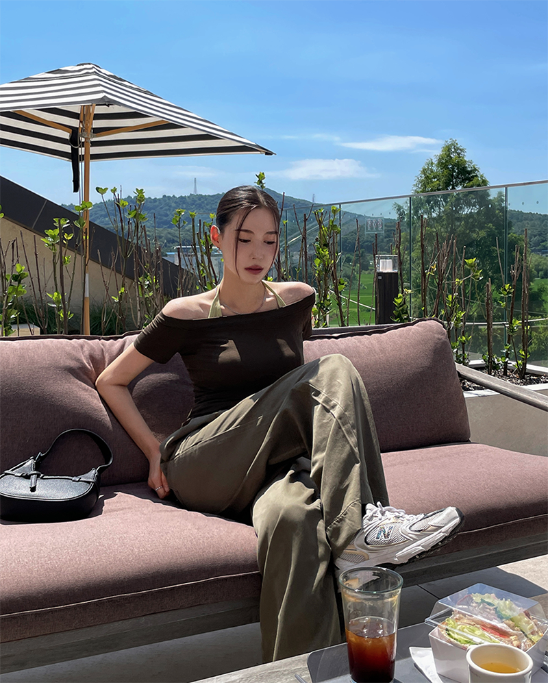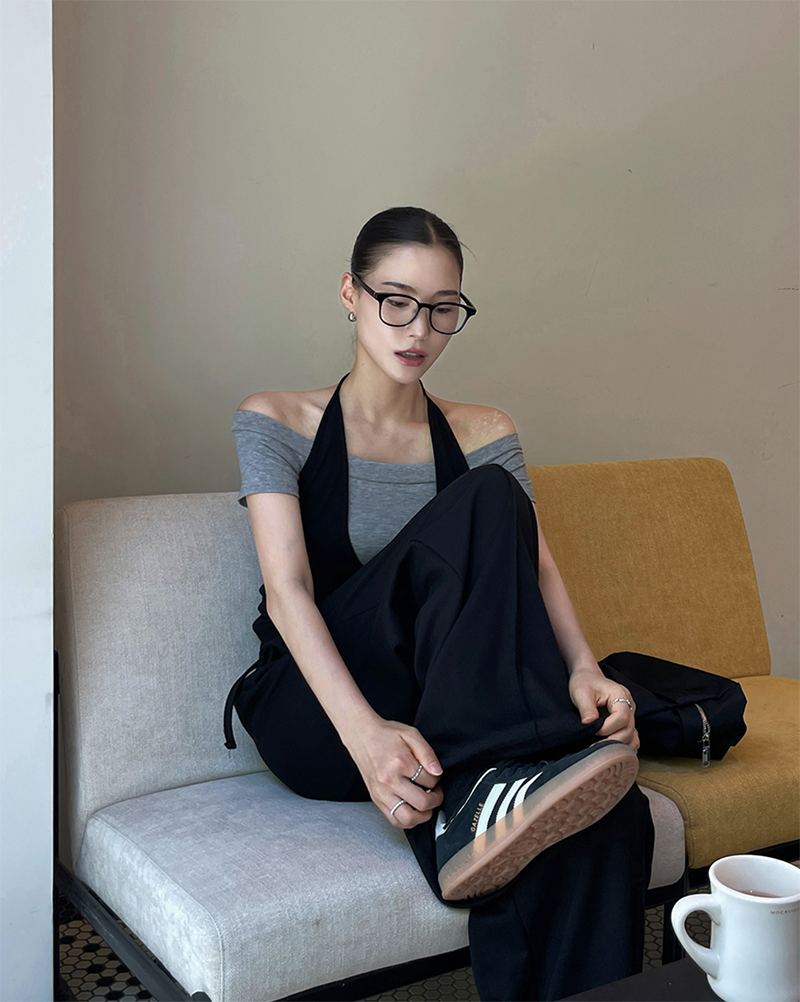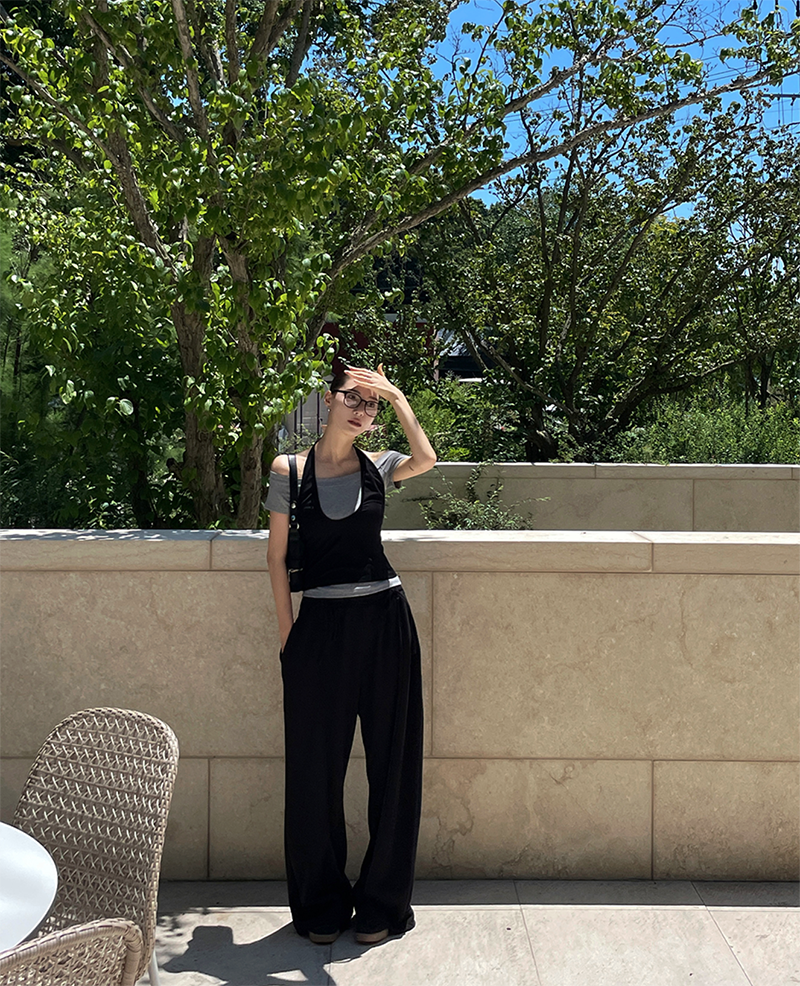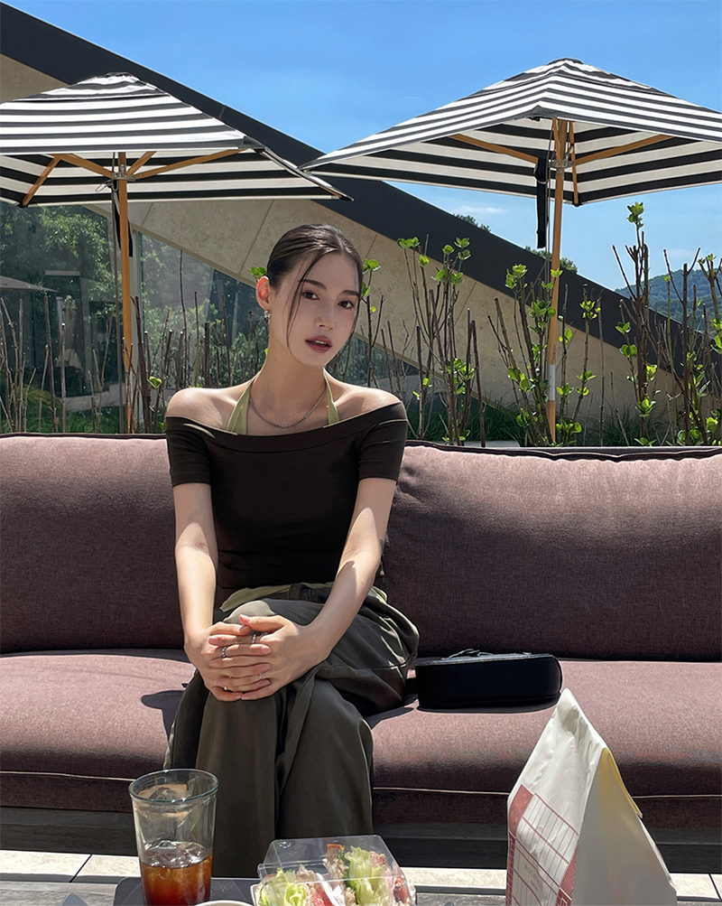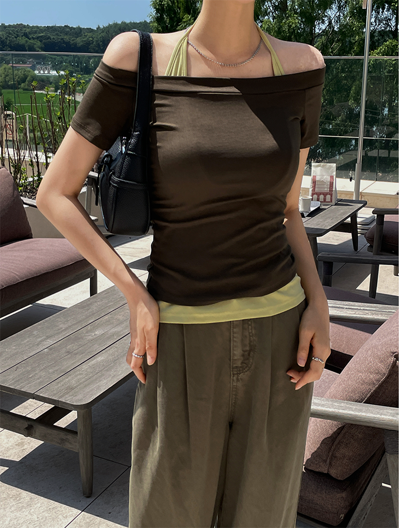 結合配色露肩T與內搭掛脖背心的時髦套裝