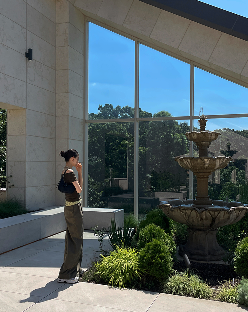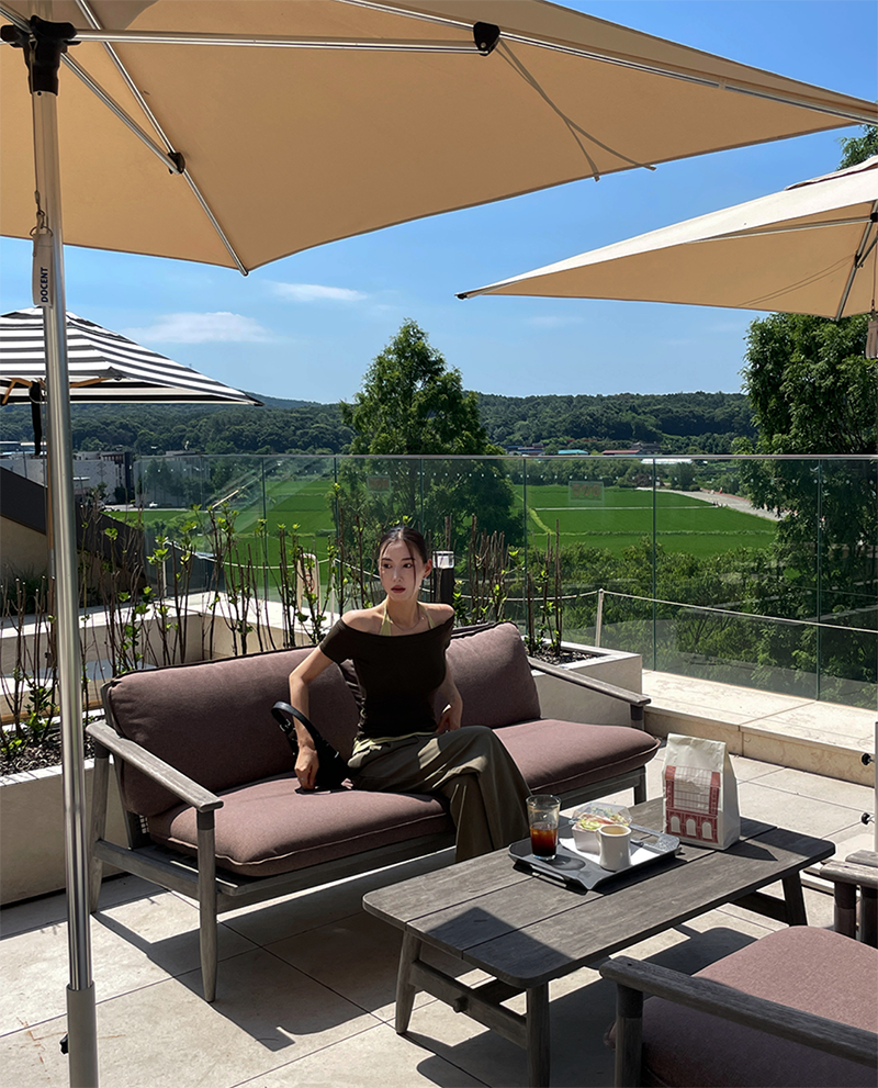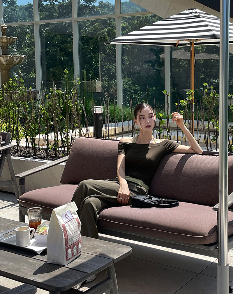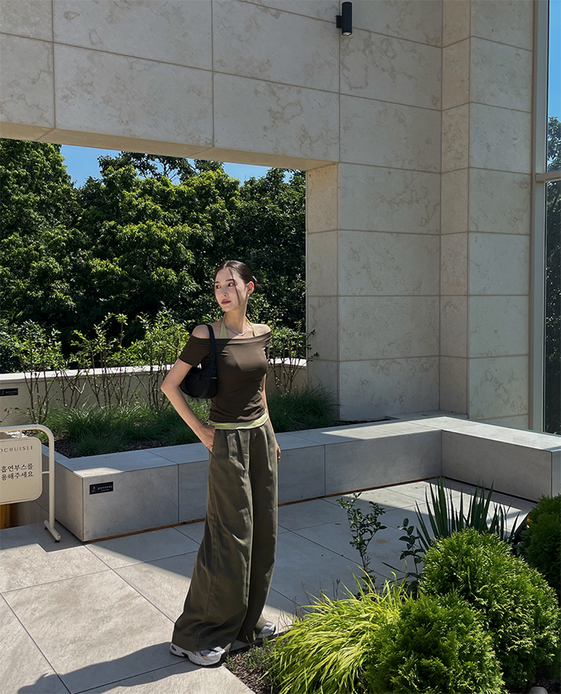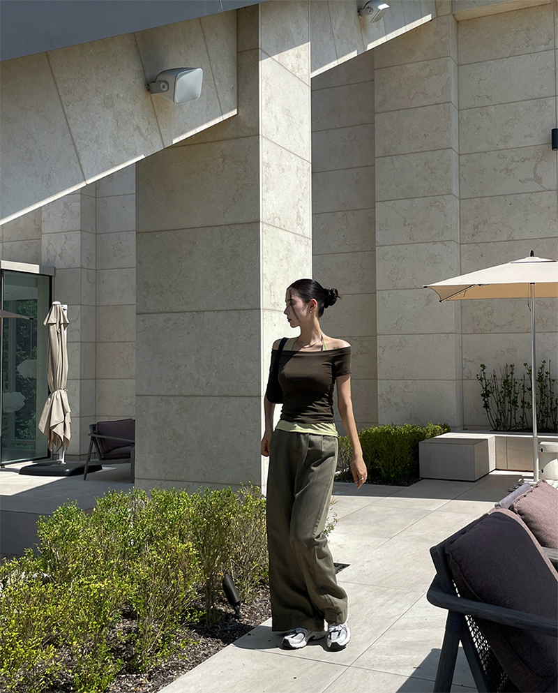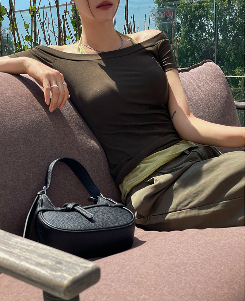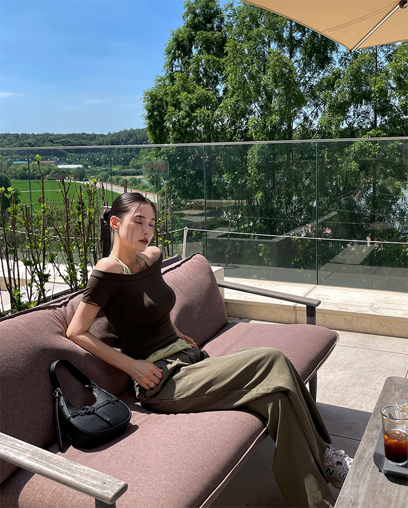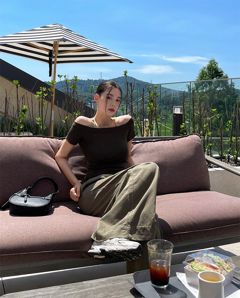 結合配色露肩T與內搭掛脖背心的時髦套裝