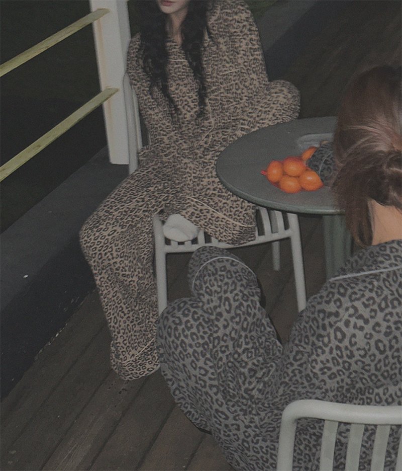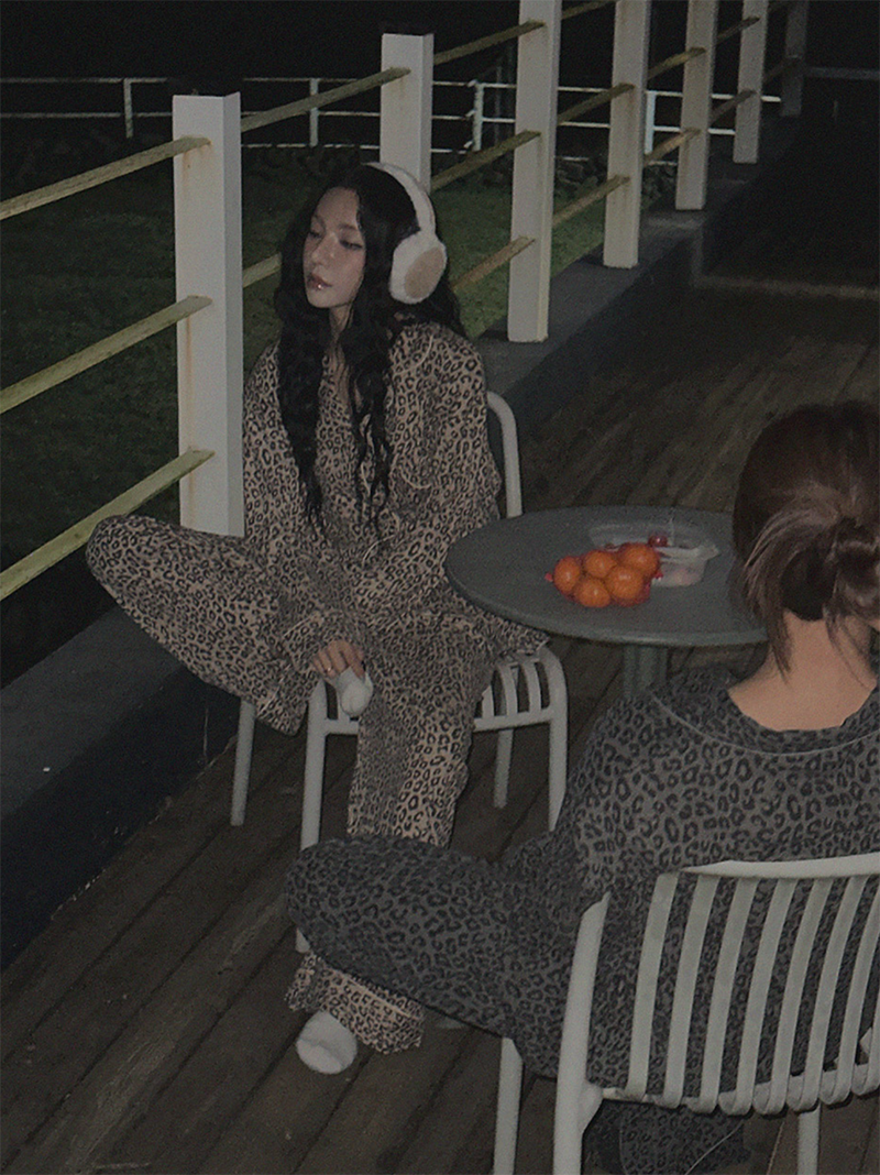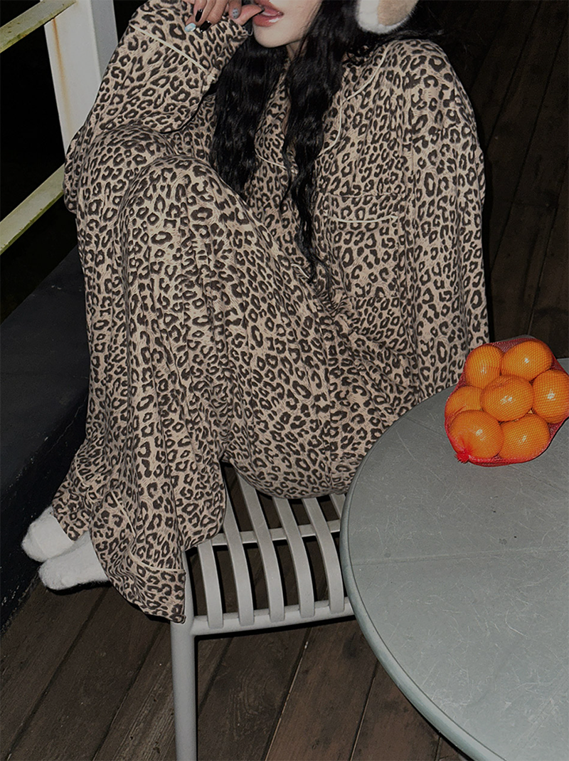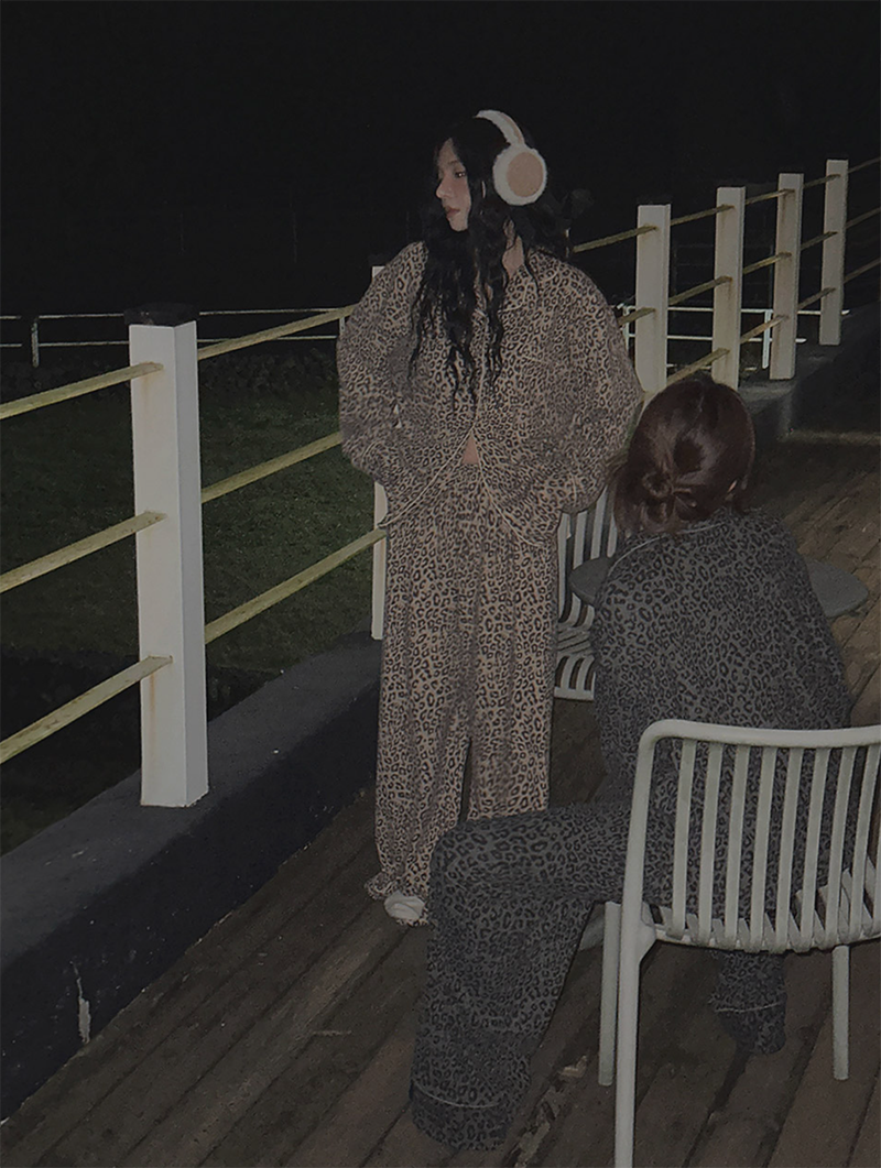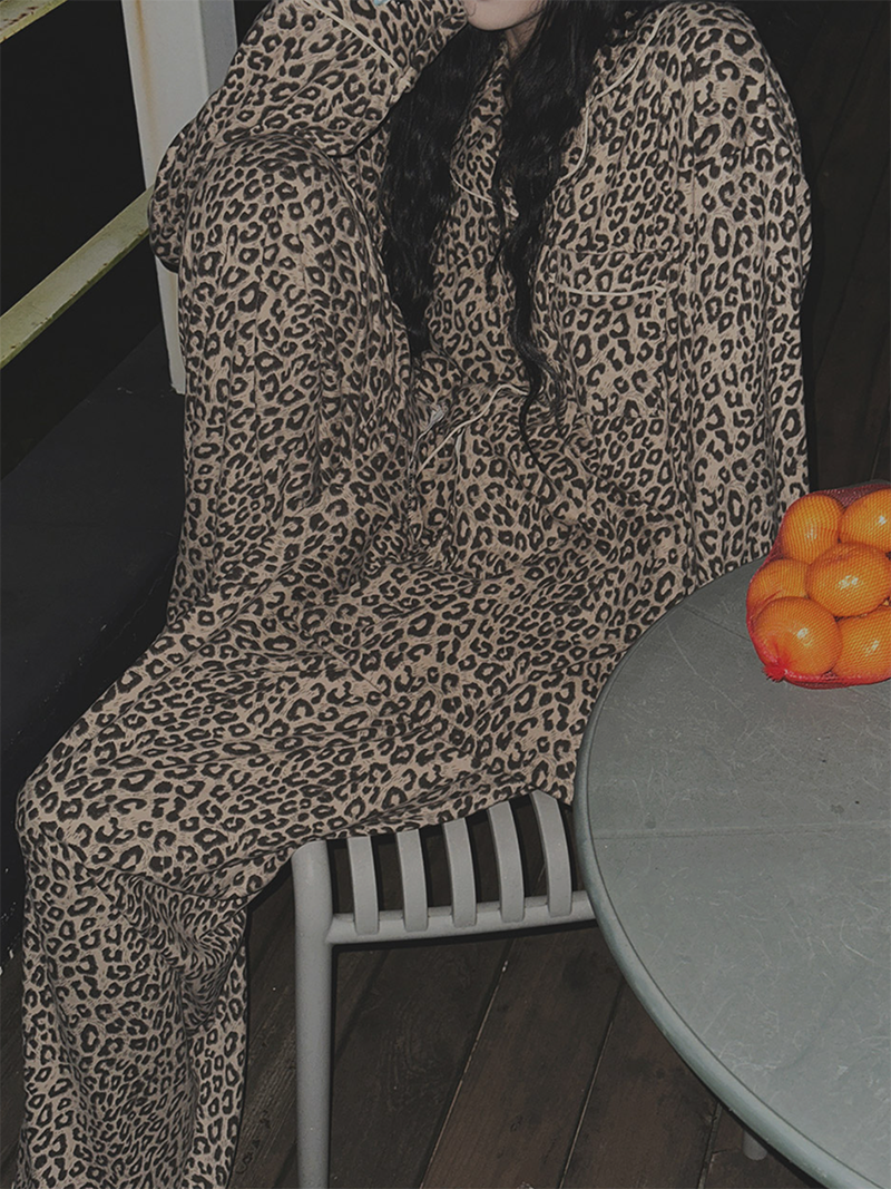 以柔軟桃皮刷毛打造的豹紋睡衣套裝