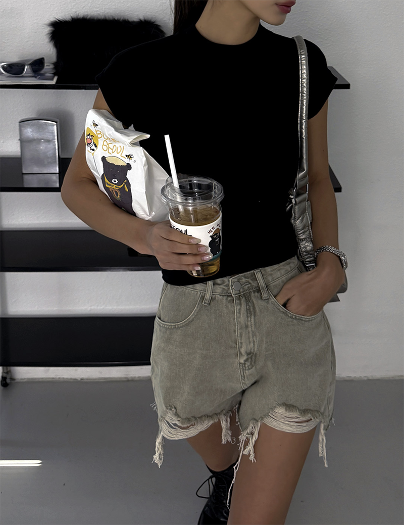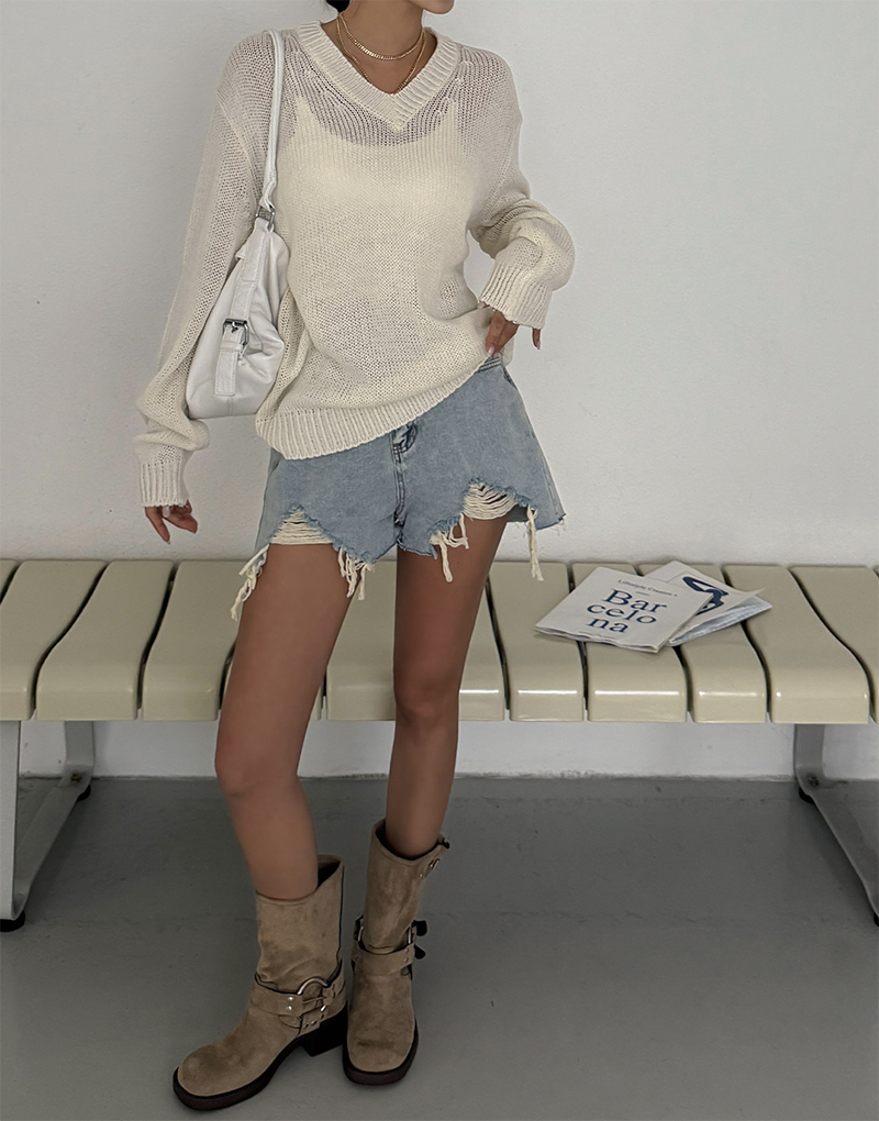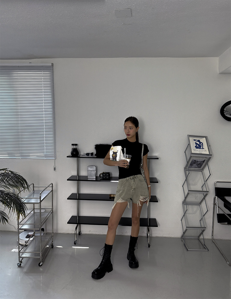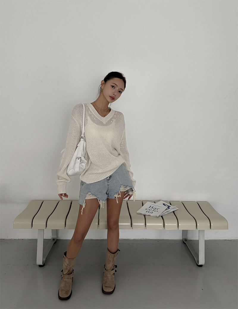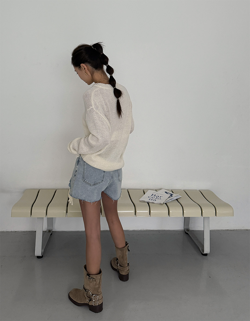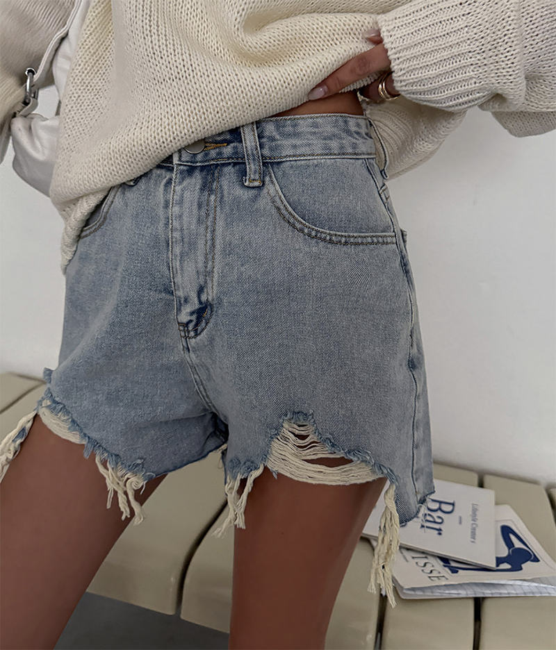 褲擺不規則的割破剪裁 搭配隨性抽鬚