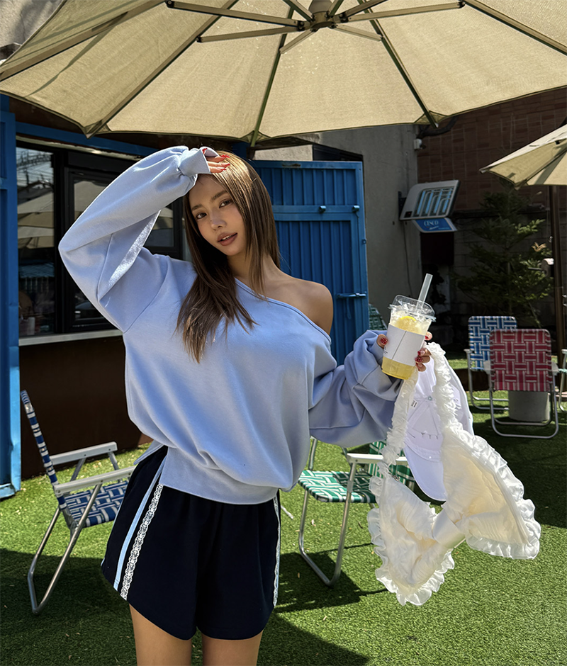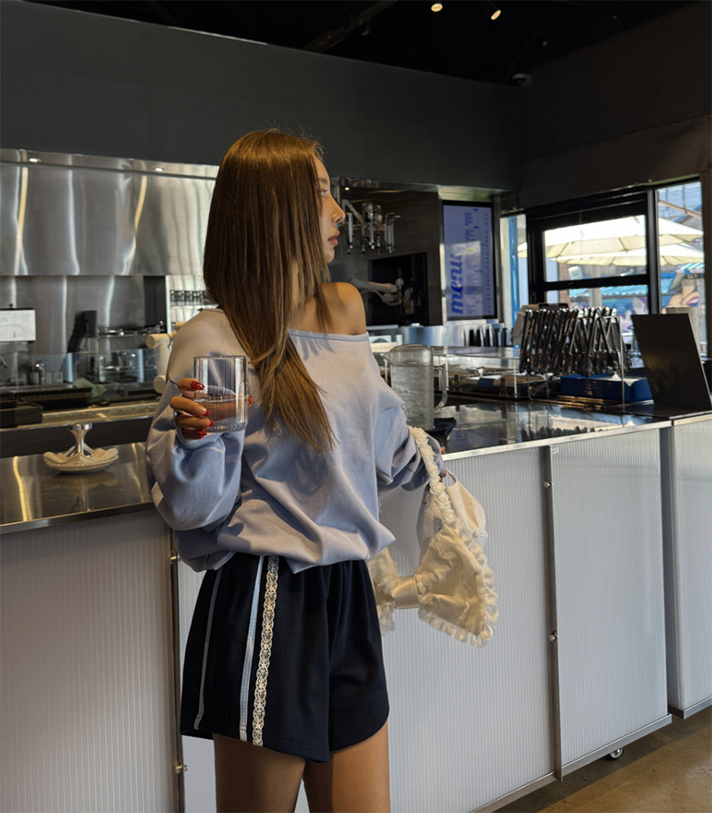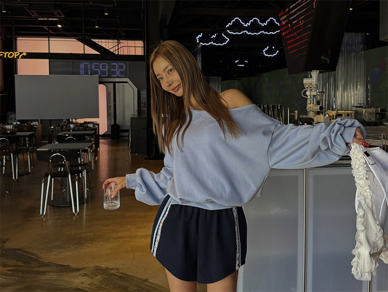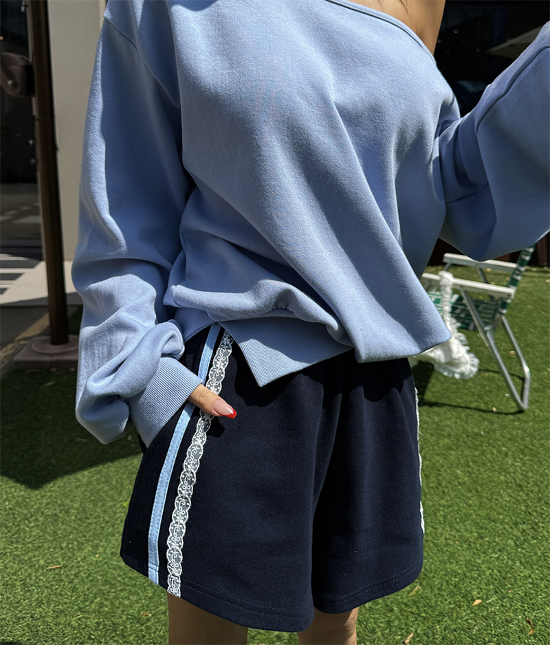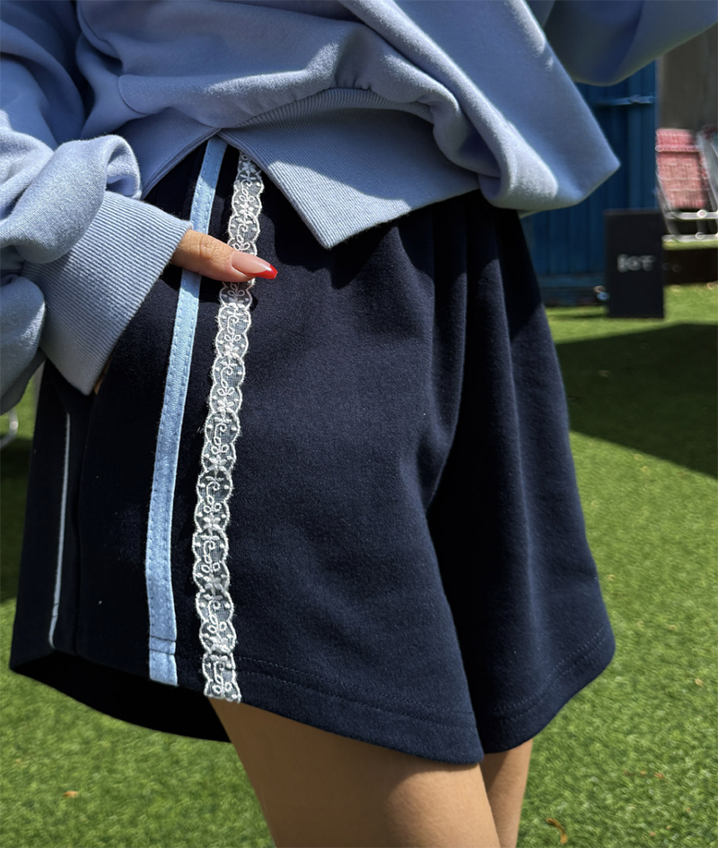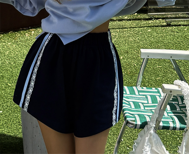 彈力腰頭搭配側邊拼接蕾絲與撞色線條