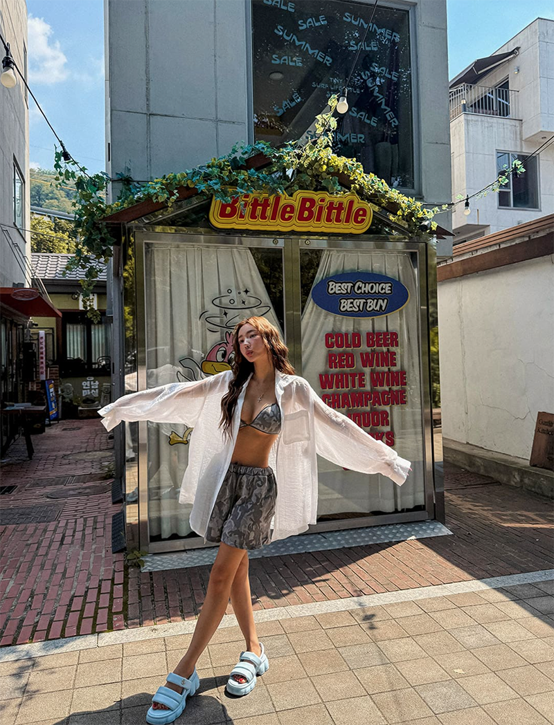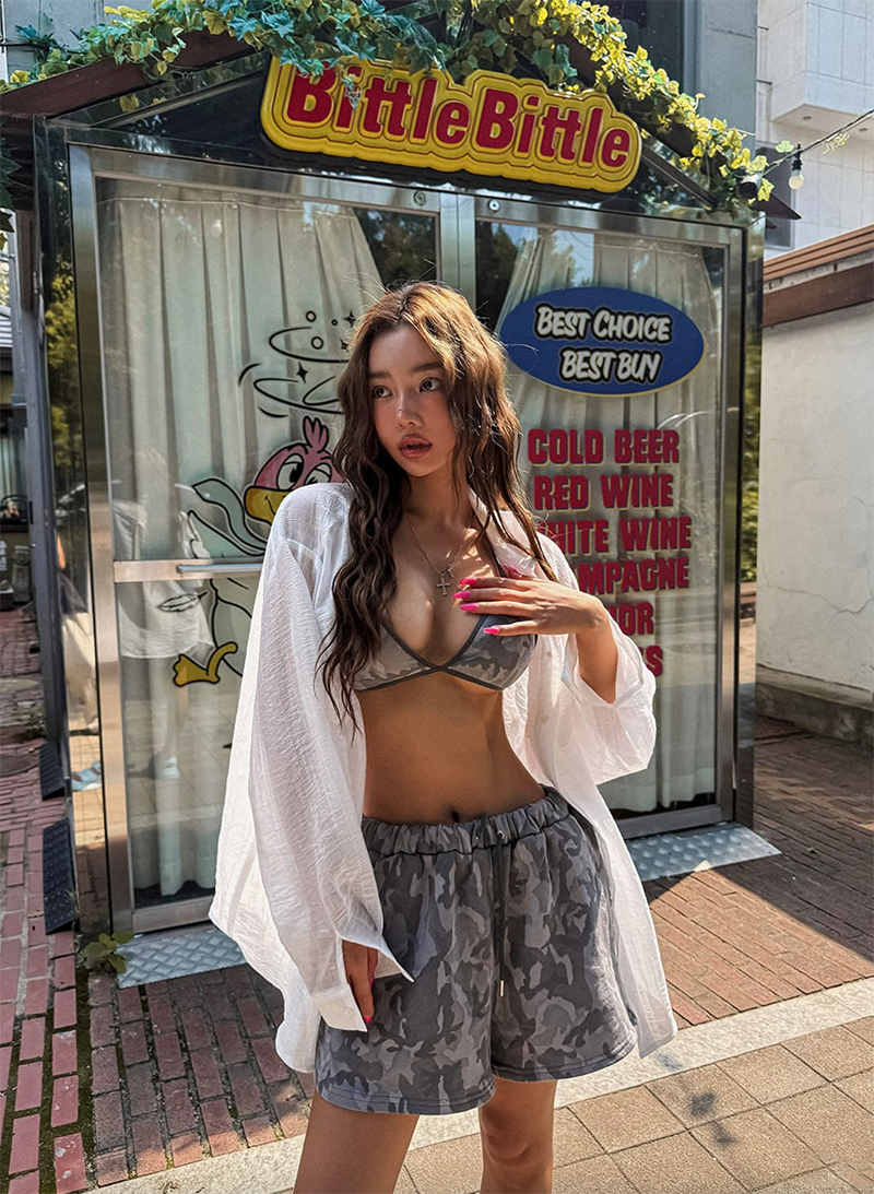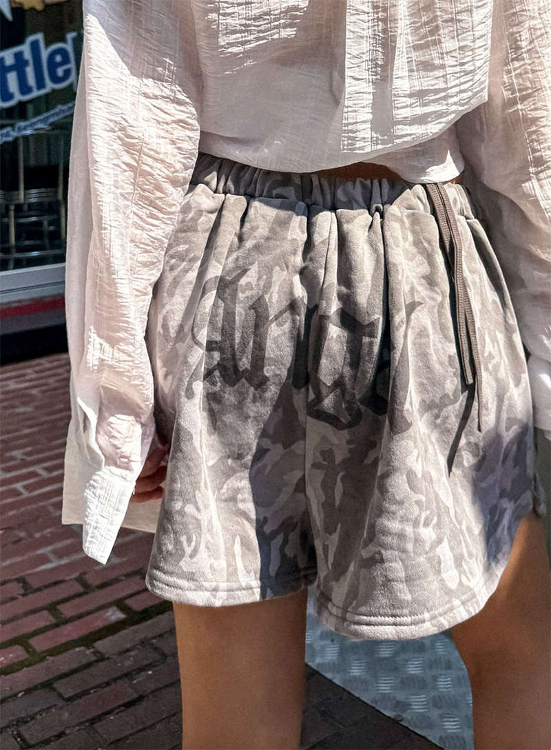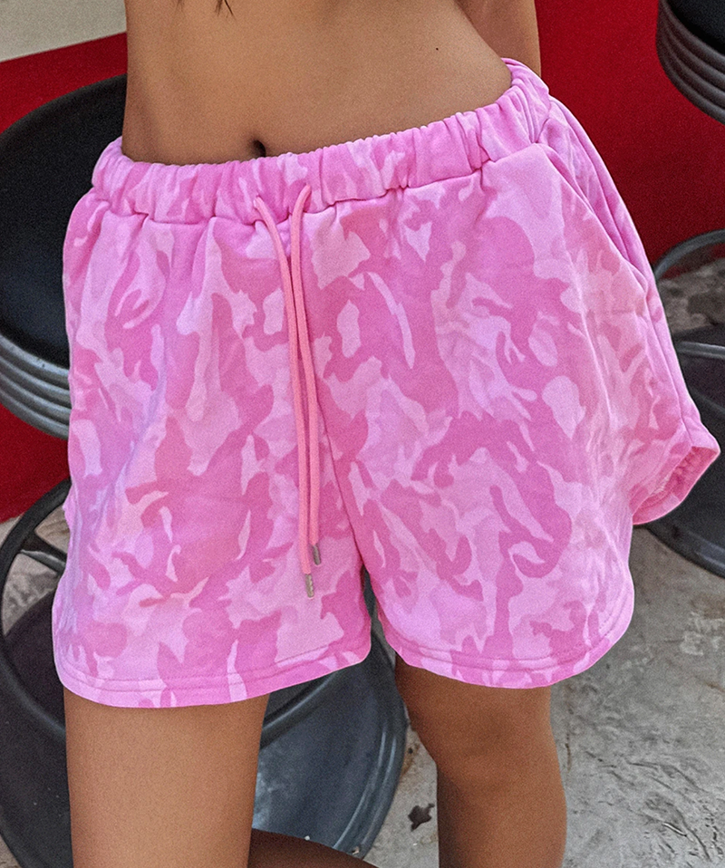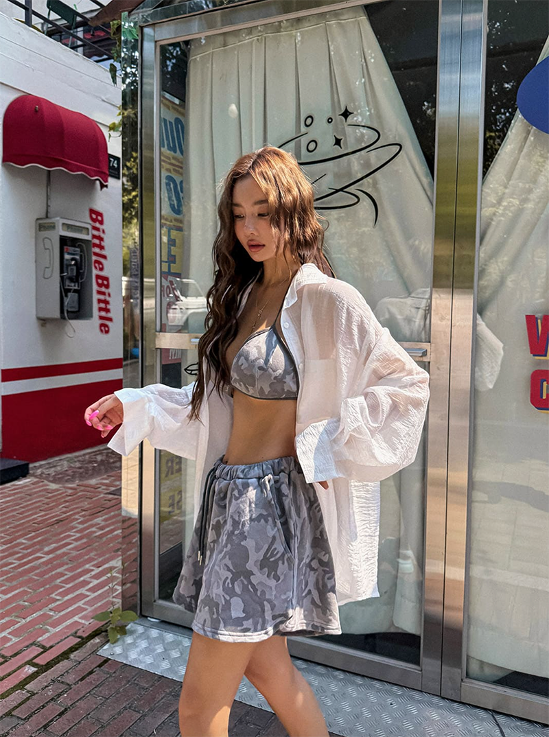 結合活潑迷彩印花與俏皮臀部印刷細節