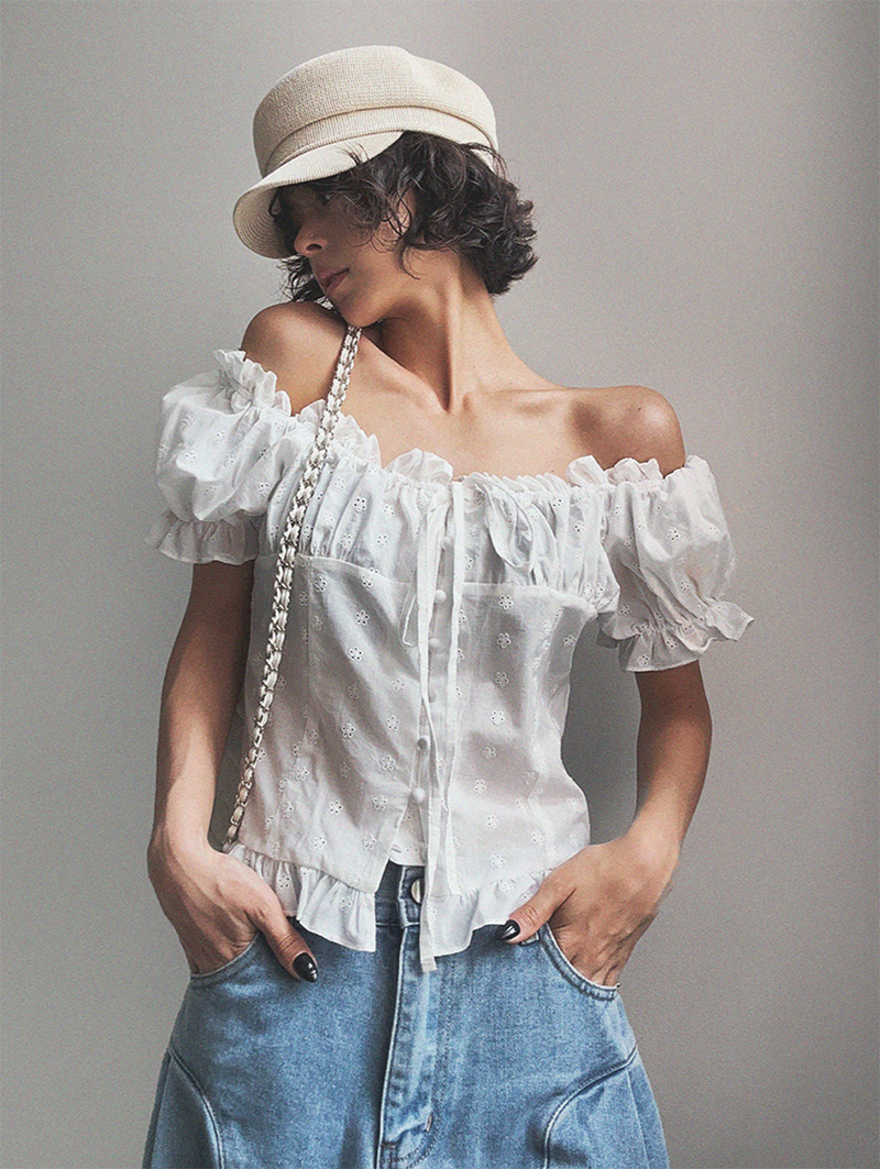 整件花朵鏤空設計搭配肩部鬆緊帶