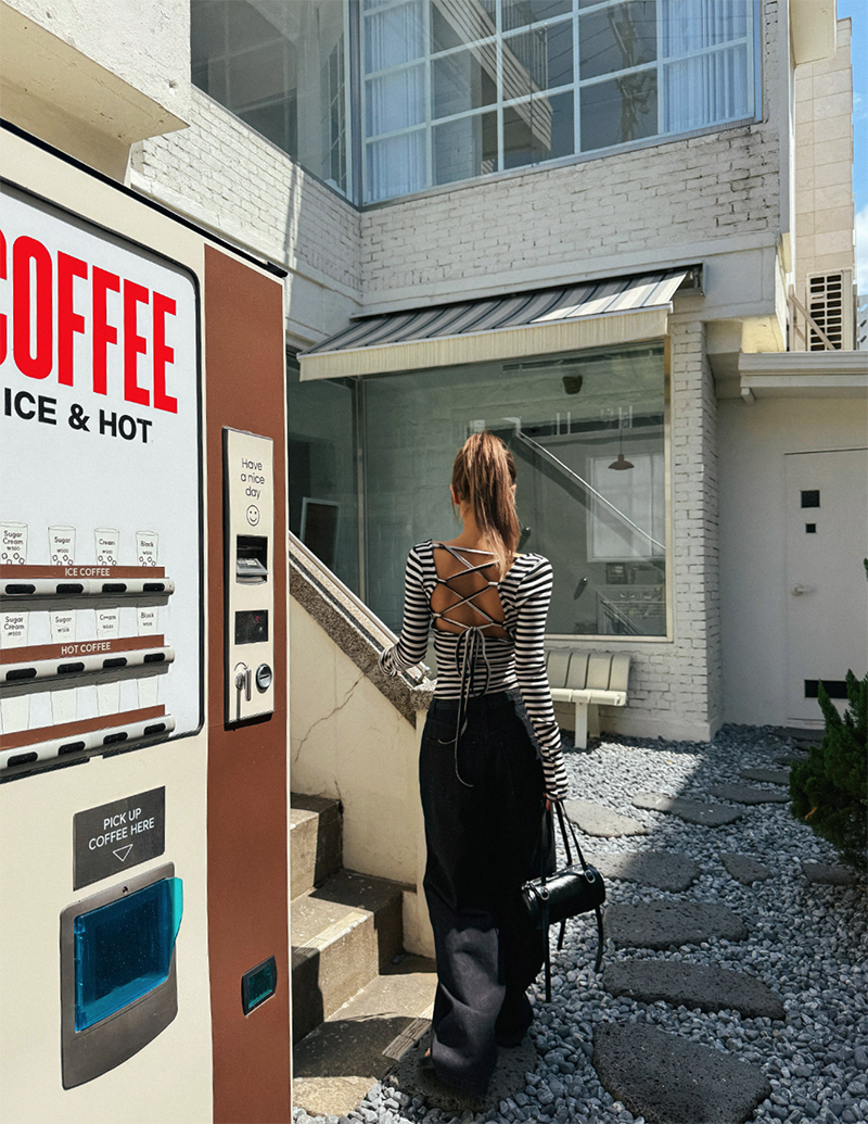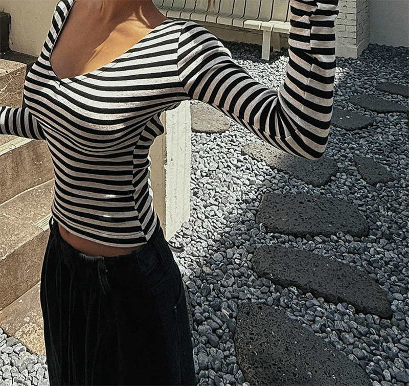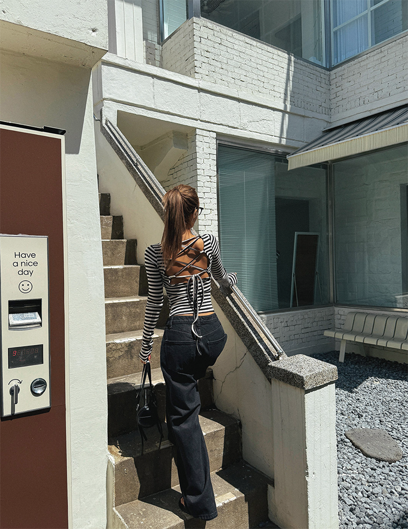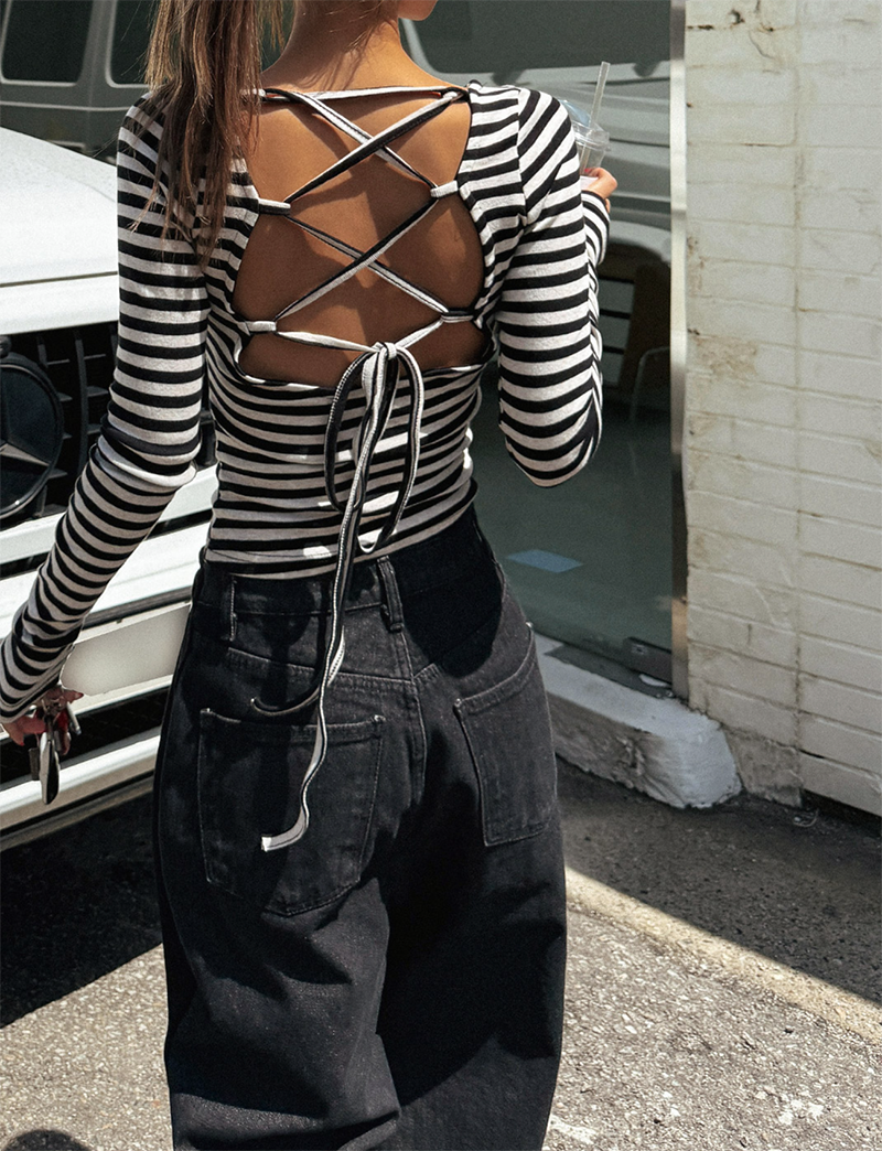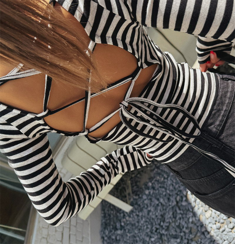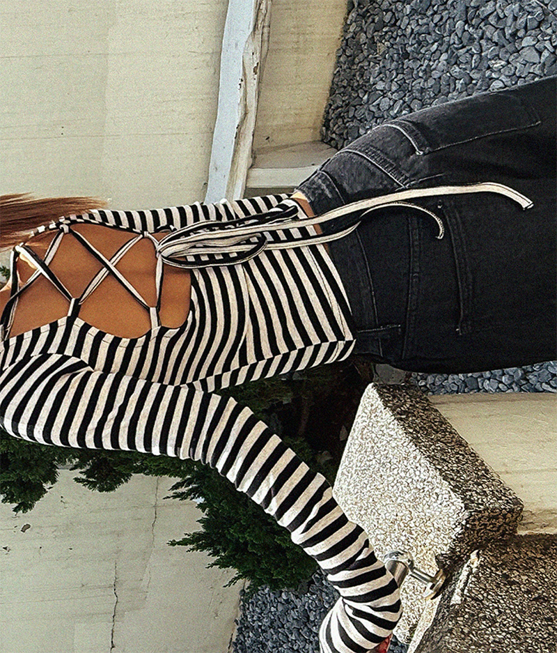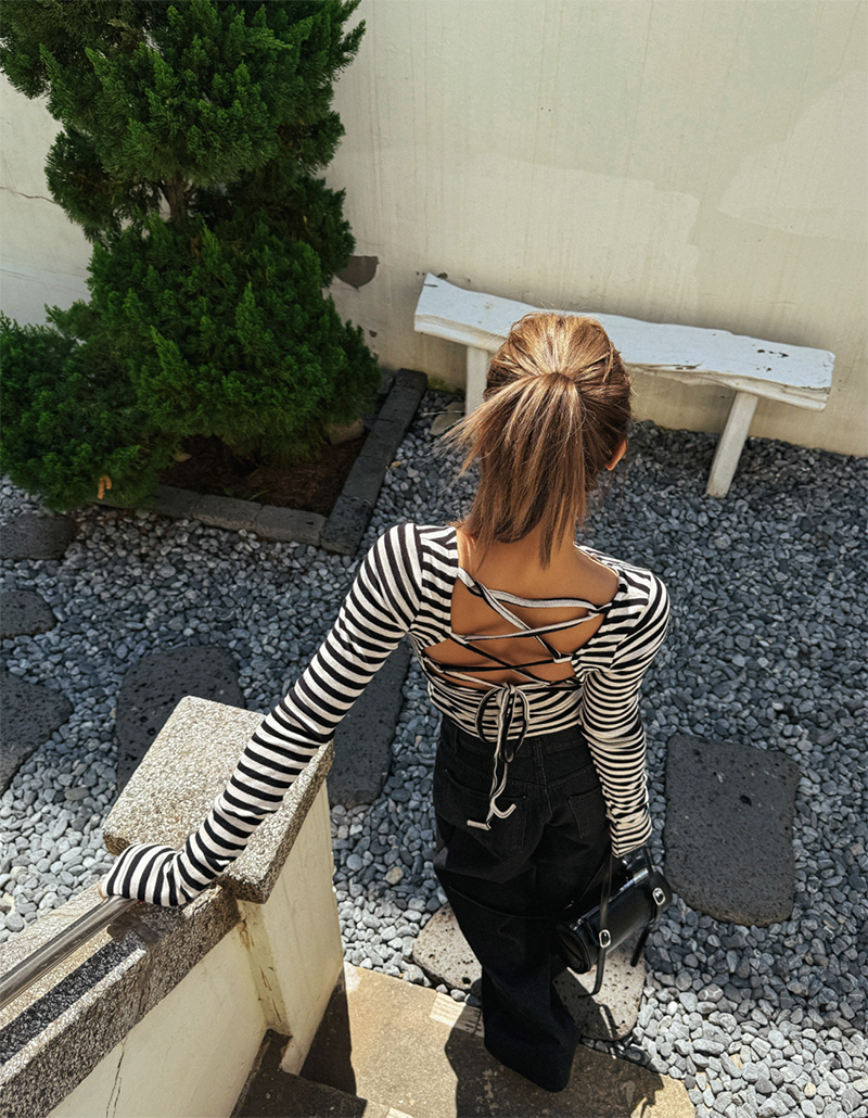 吸睛條紋圖樣結合後背鏤空綁帶設計