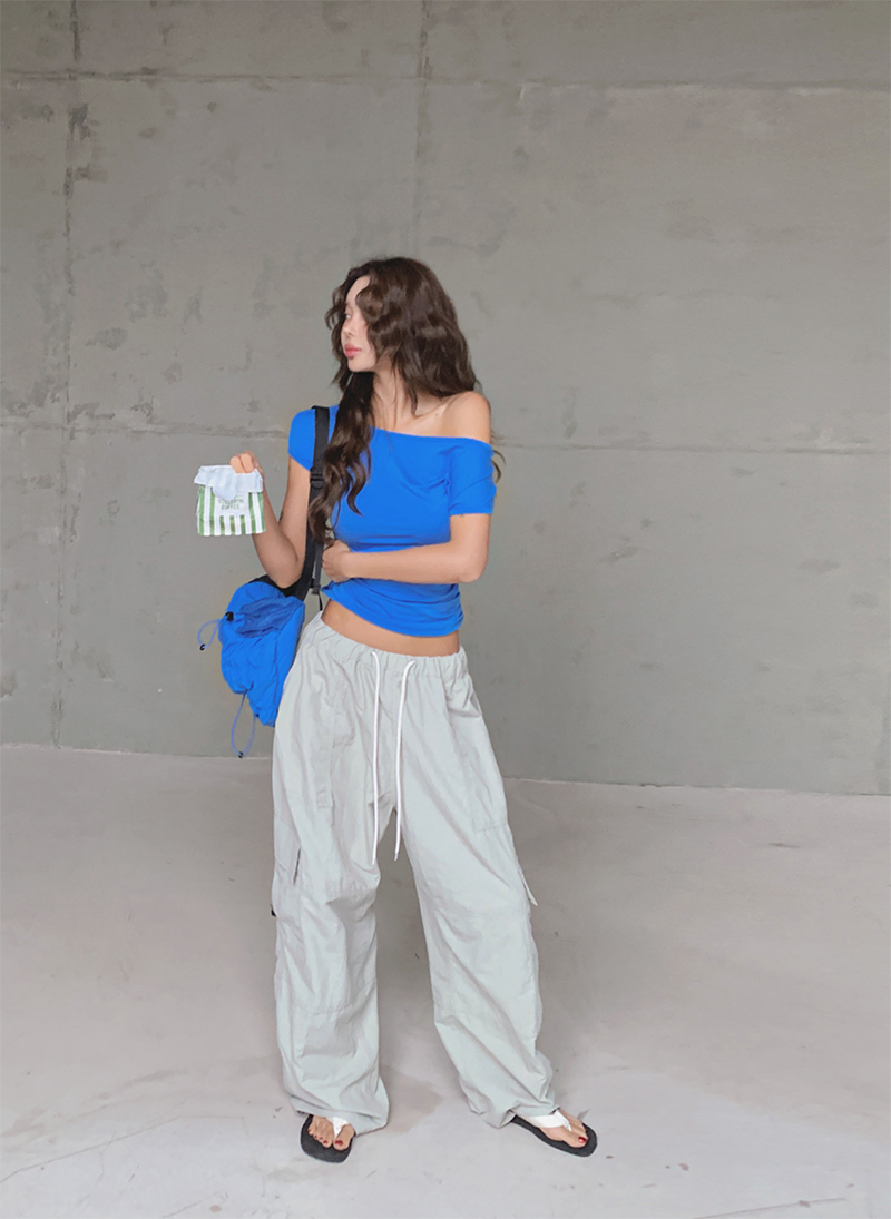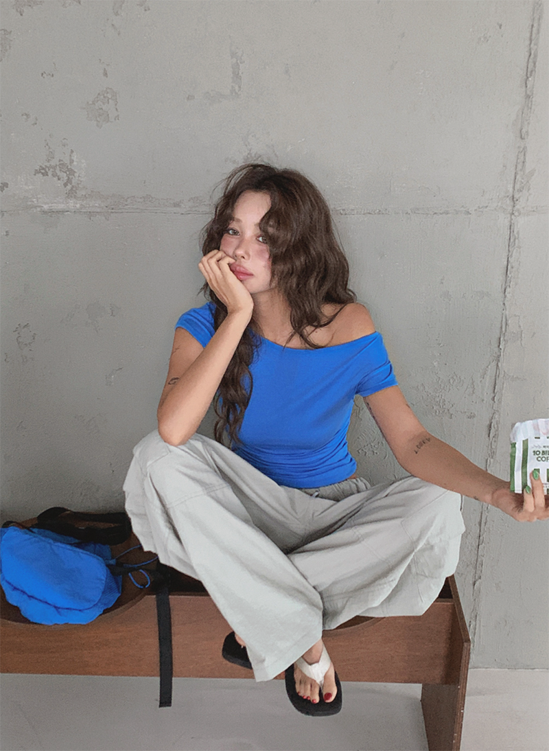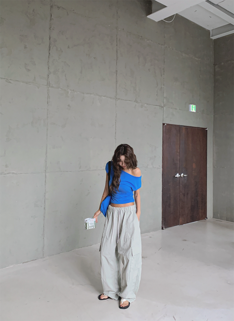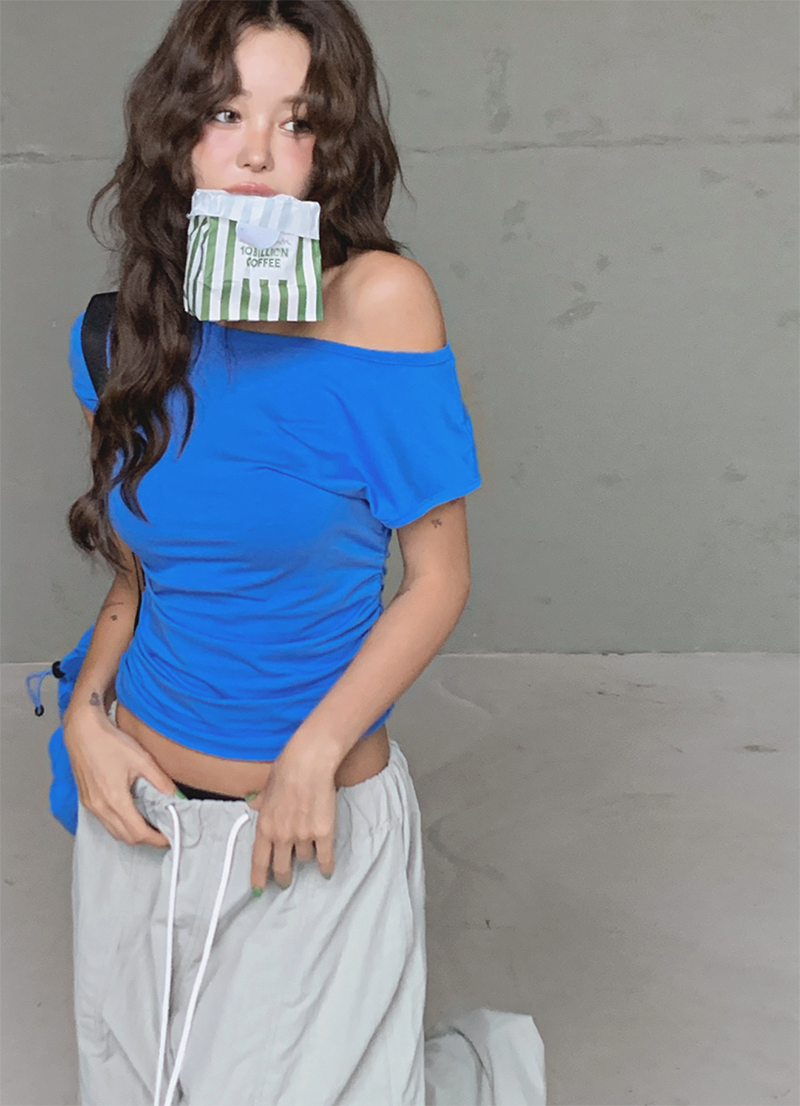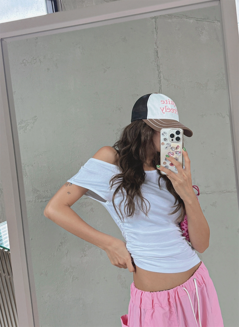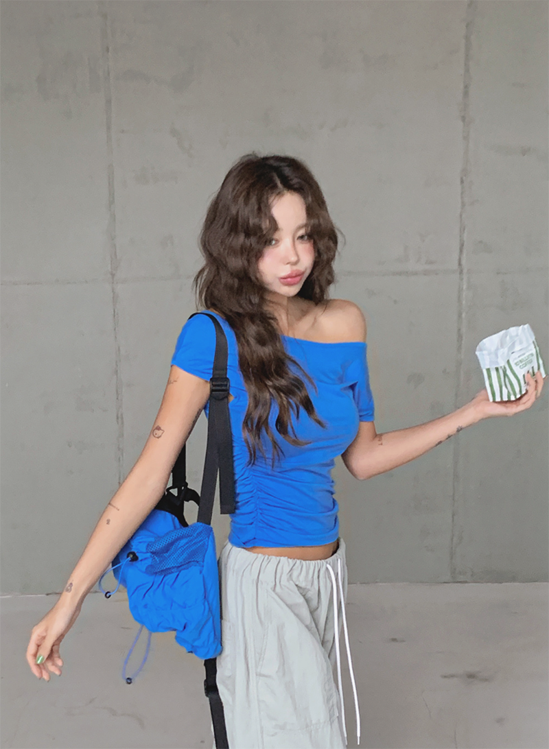 大圓領搭配不對稱抓皺設計