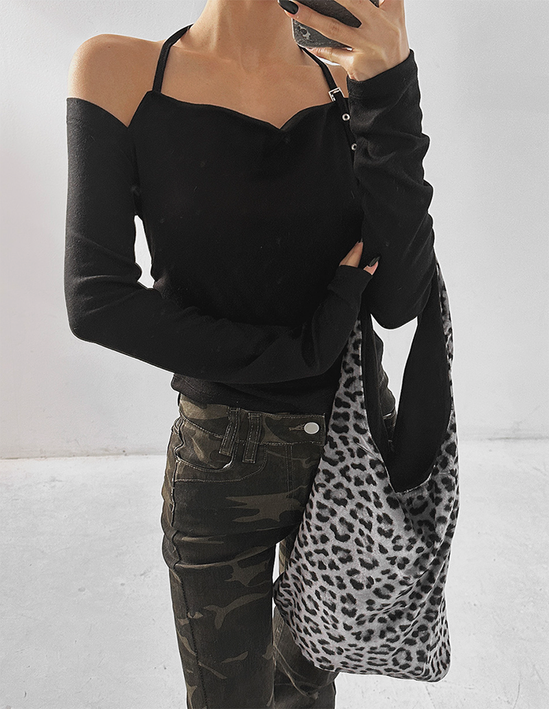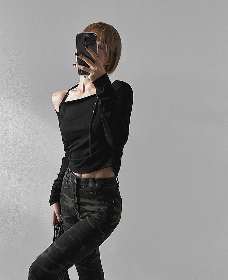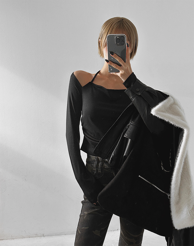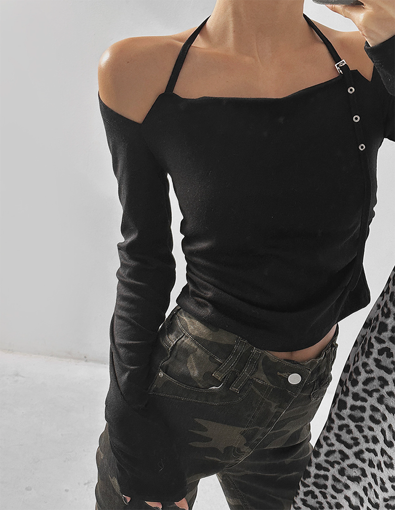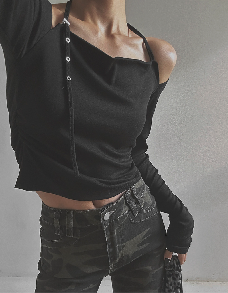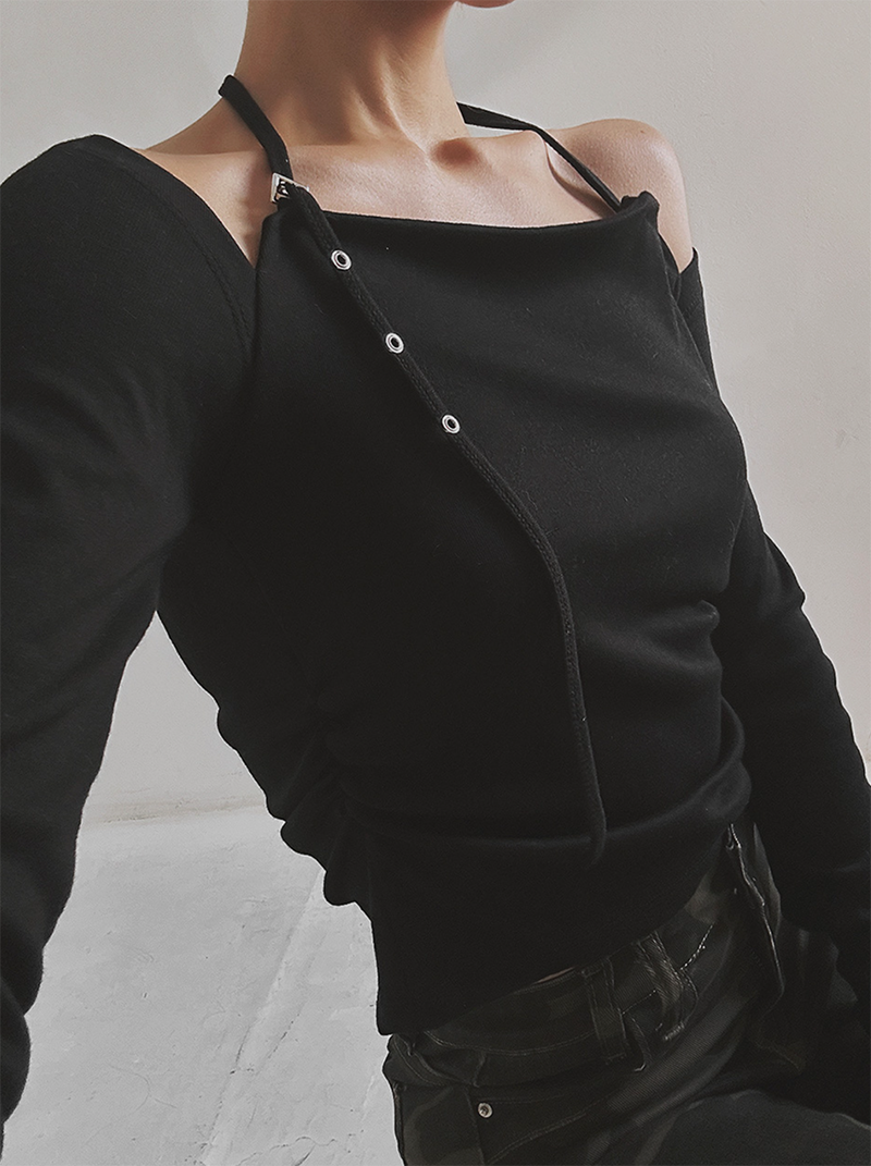 洞洞綁帶的繞頸設計展現迷人鎖骨線條
