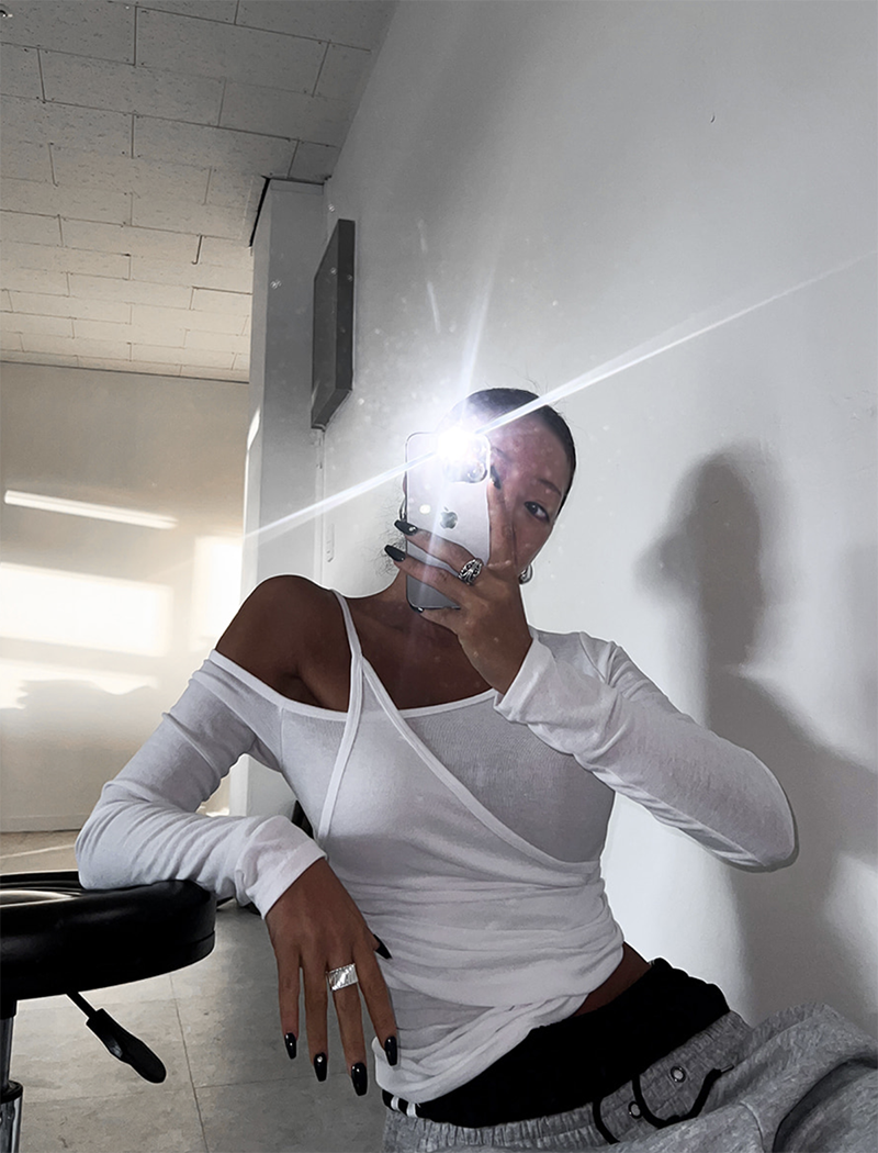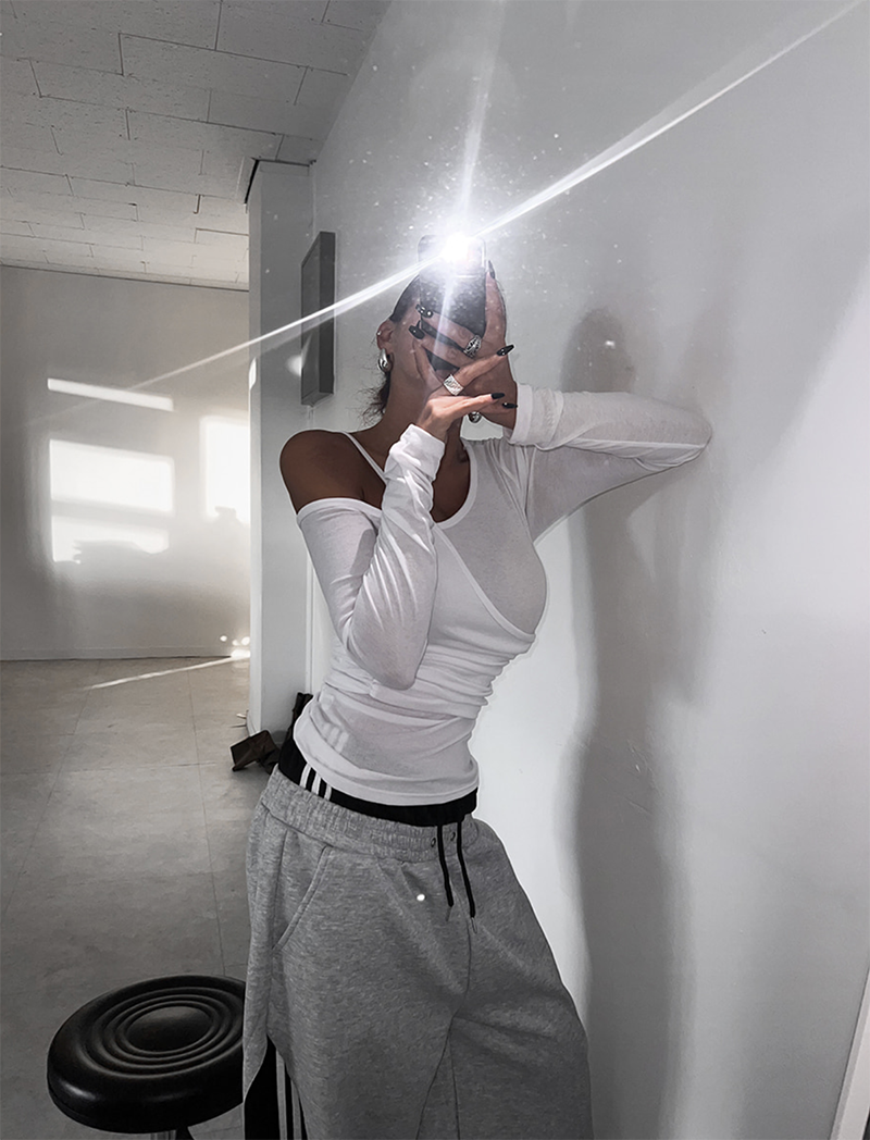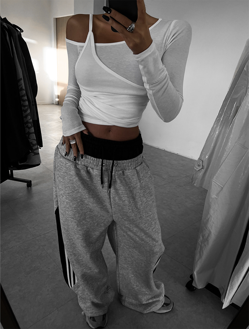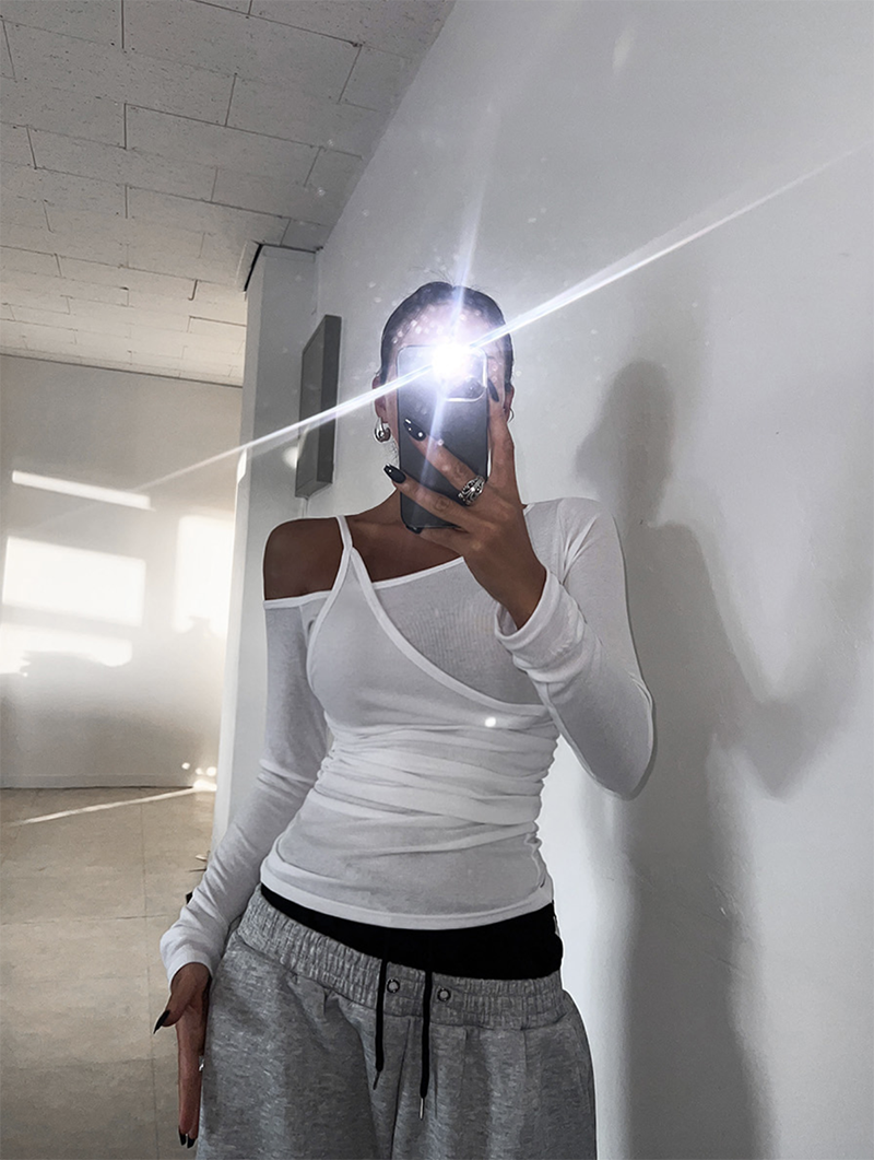 以簡約卻帶設計感的斜肩交叉剪裁