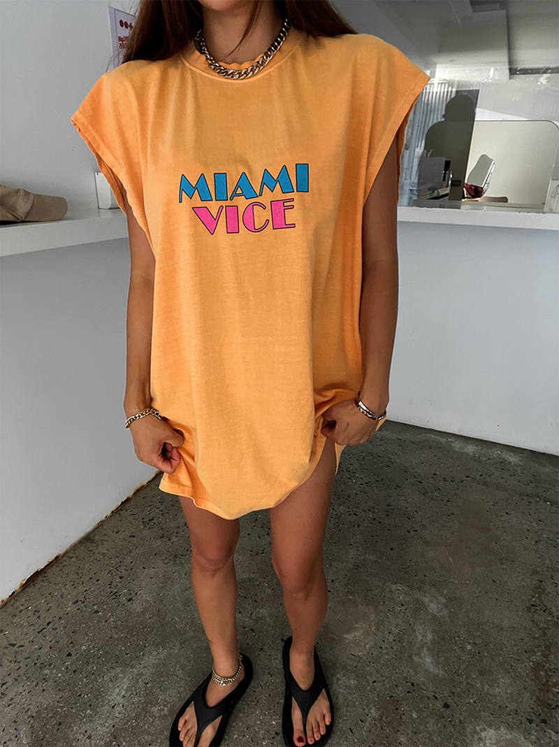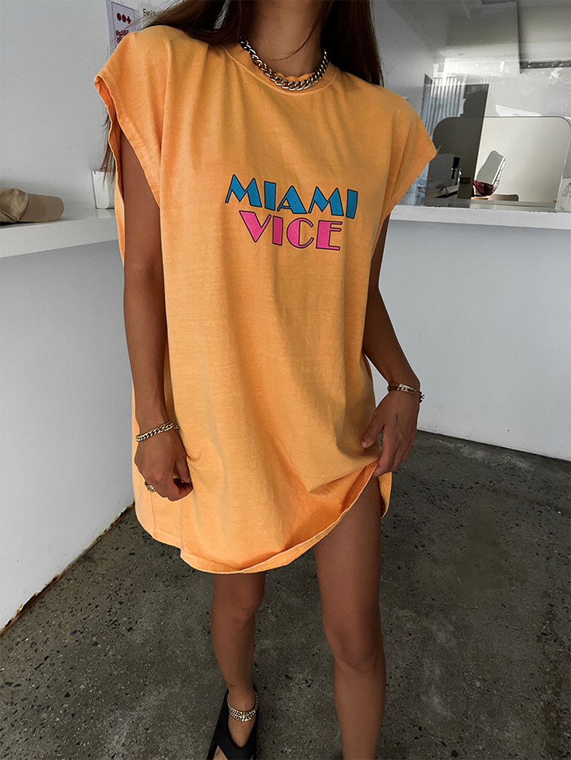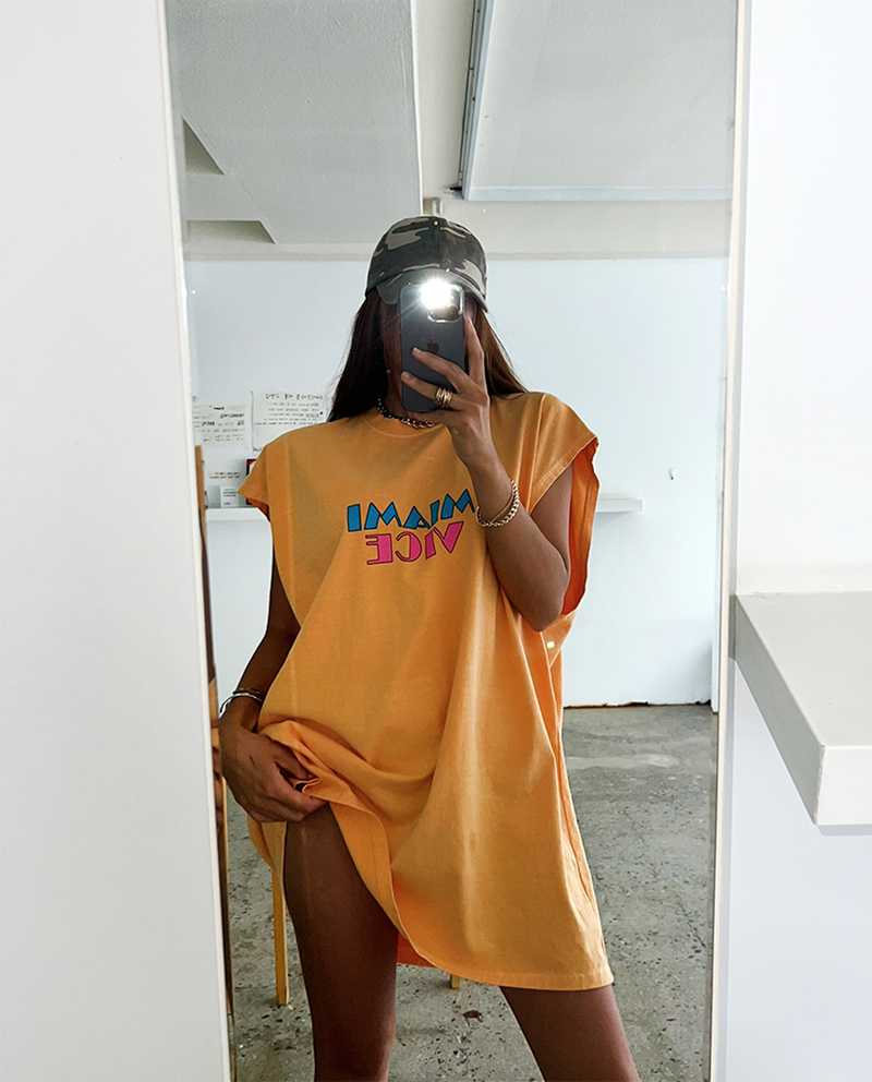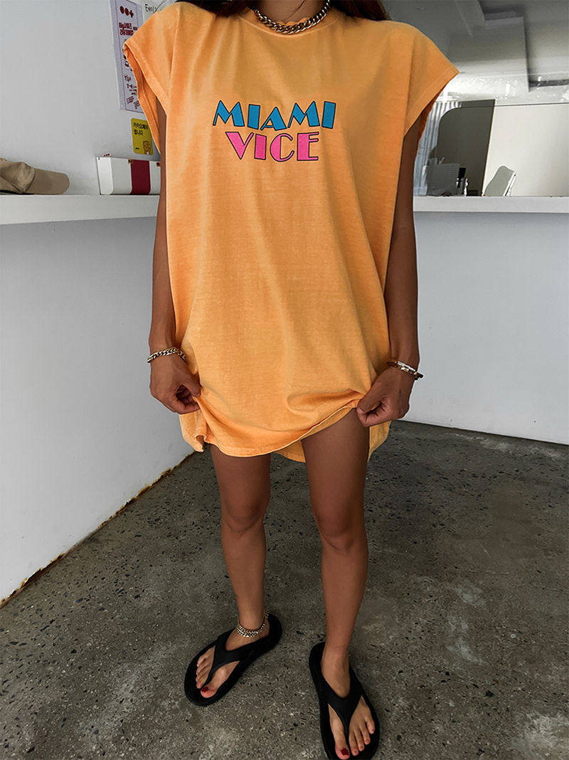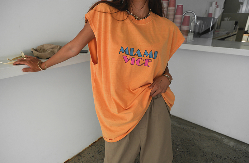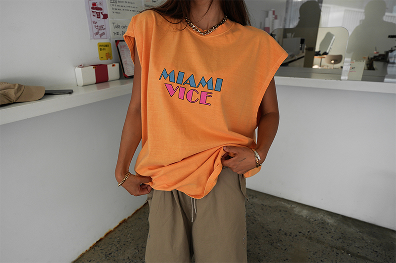 寬鬆自在的輪廓搭配MIAMI VICE字樣